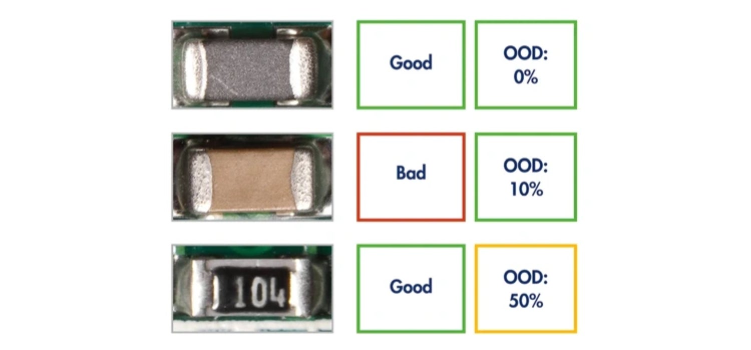 新しいディープラーニング機能「分布外(OOD)検出」は、学習データに含まれていなかったタイプの対象物であるかどうかを判定することができる機能です。例えば、赤または黄色のラベルのボトルのみで学習したモデルを使ってクラス分類を行う際に、緑色のボトルが検査対象となった場合、強引に赤か黄色に分類するのではなく、「これはこれまでに学習したことが無い対象物です」といった判断が可能となります。