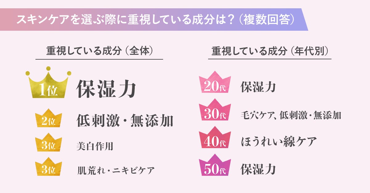 スキンケアを選ぶ際に重視している成分に関する年代別の回答からは、年代によって保湿力や毛穴ケア、ほうれい線ケア、低刺激などスキンケアを選ぶ際に重視する成分が異なることがわかりました。