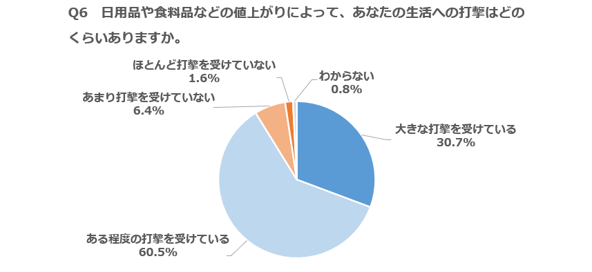 - 物の値段の値上がりで「大きな打撃を受けている」「ある程度の打撃を受けている」は計91.2%に上った。昨年5月の調査計74.9%から16.3ポイント増。「大きな打撃を受けている」人を職業別に見ると、医療・福祉関係の職員等と教職員が4割台で最多層、次いで契約社員・パートやアルバイト等、年金生活・無職、専業主婦・主夫がいずれも3割台だった。年収別で見ると、収入がない人が5割台と最多で、次いで500万円未満の各層が3割から4割台となった。(Q6)