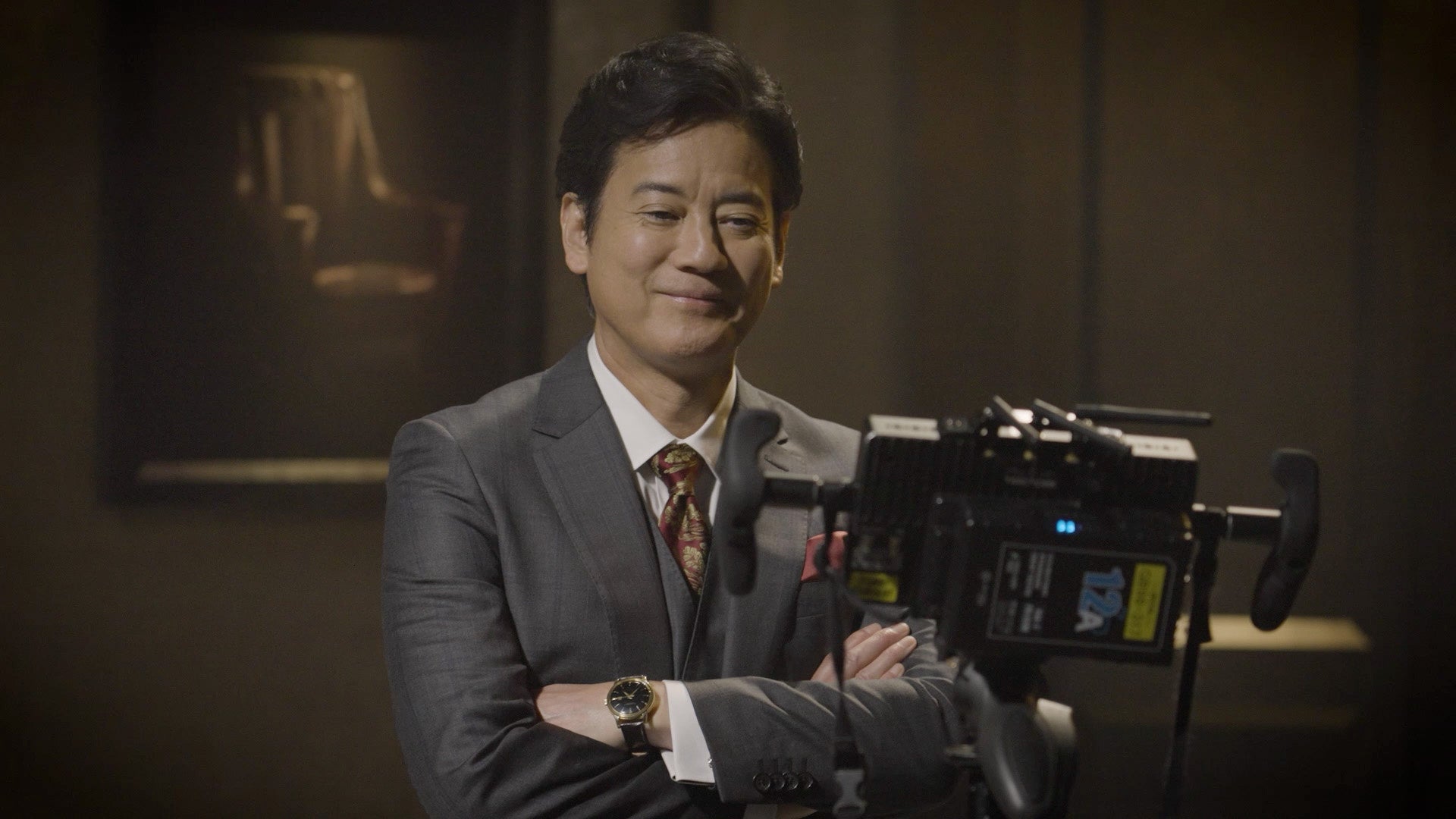 撮影はフラグシップモデルのマッサージチェアに相応しい重厚感のあるセットで行われました。唐沢さんはグレーのスーツを身に纏って登場。監督との打ち合わせから始まり、終始和やかな雰囲気の中でスムーズに進みました。