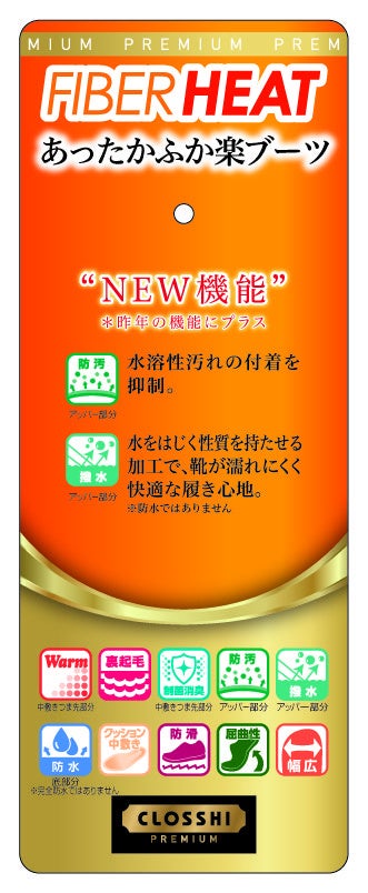 「FIBER HEAT あったかふか楽ブーツ」は、ベーシックでありながら秋・冬の様々なシチュエーションやコーディネートに合わせやすい、多機能ブーツです。 今年は新たに撥水と防汚機能を追加し、お手入れがさらに楽になりました。売価は税込2,970円です。 10月下旬には、ロング丈ブーツ税込4,070円も販売予定です。
