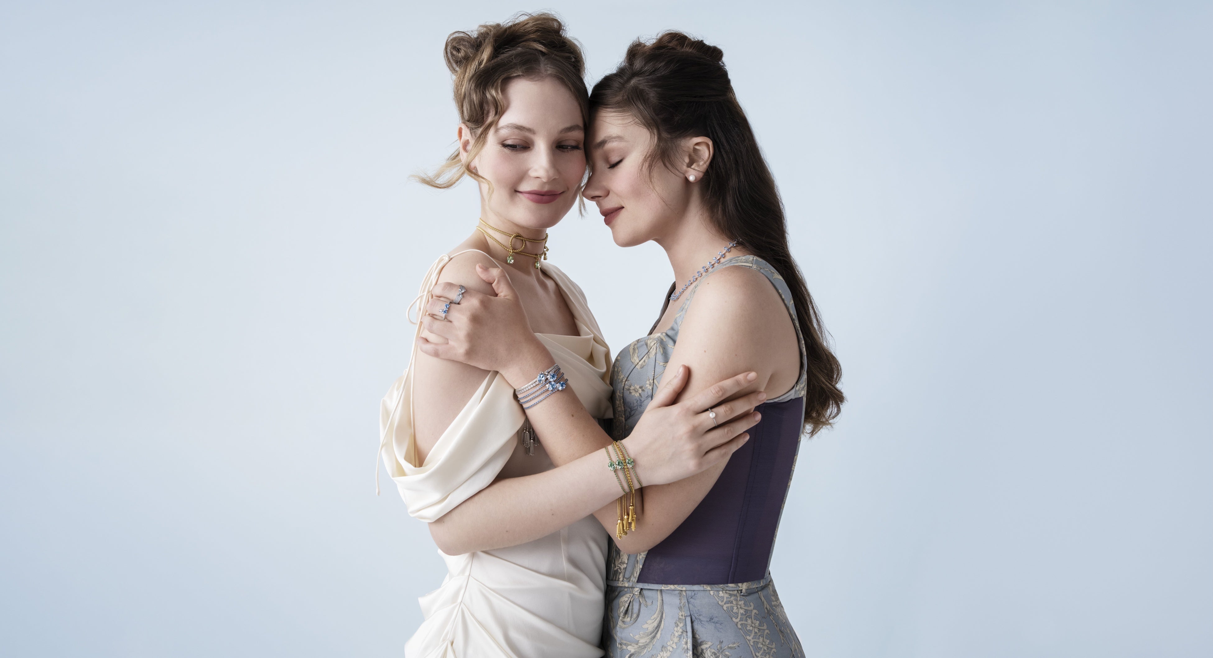 本コレクションのキャンペーンには、「ブリジャートン家」でフランチェスカ・スターリング(Francesca Stirling)役を演じるハンナ・ドッド(Hannah Dodd)、およびエロイーズ・ブリジャートン(Eloise Bridgerton)役を演じるクラウディア・ジェシー(Claudia Jessie)が出演。撮影はファッションフォトグラファーのティム・ウォーカー(Tim Walker)、スタイリングはハリー・ランバート(Harry Lambert)が手がけ、ブリジャートン家のグラマラスでロマンチックな世界観を、現代的な表現で描き出しています。