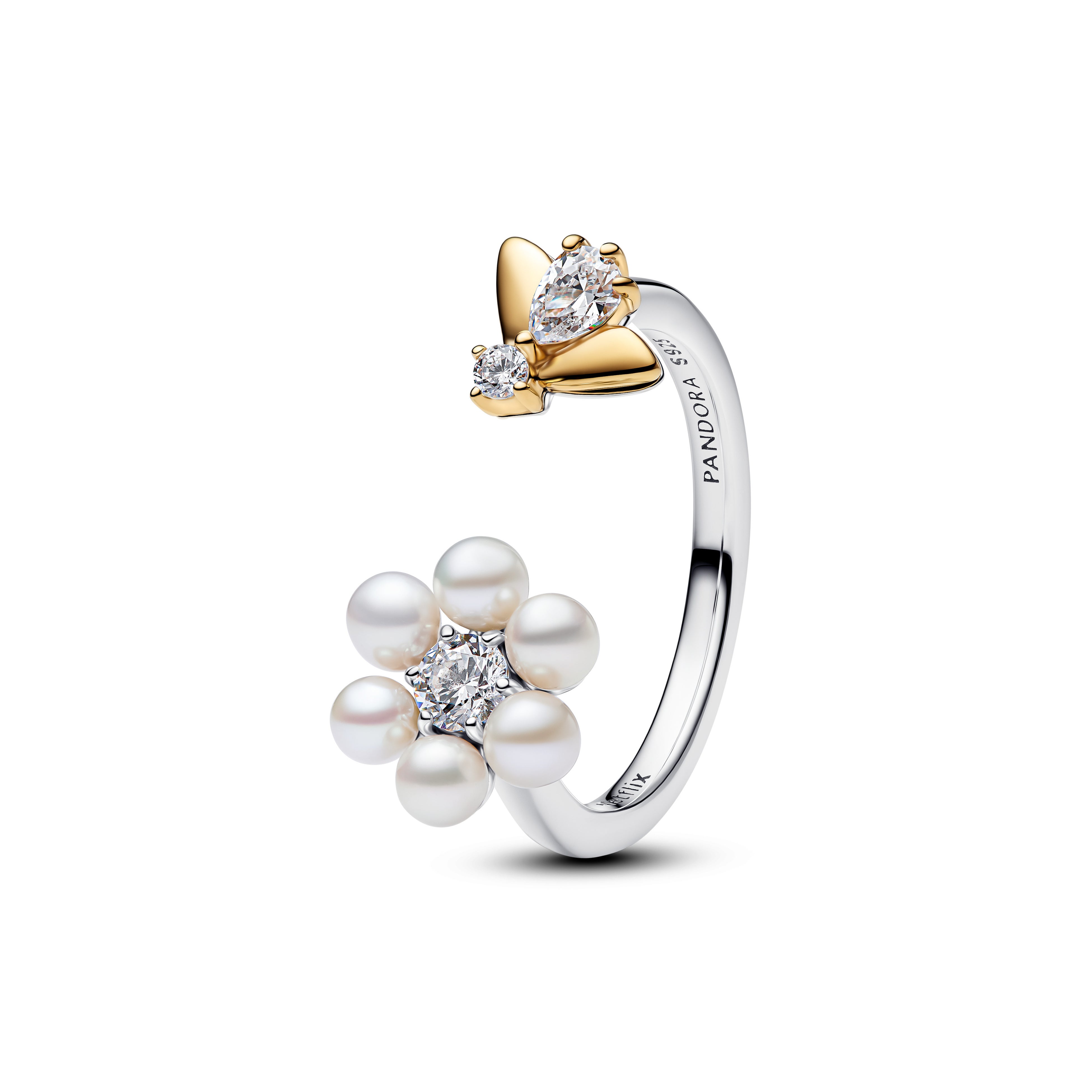 誠実さやコミュニティを象徴する蜂は、ブリジャートン家の世界観を象徴するモチーフのひとつとして繰り返し描かれてきたアイコンです。本コレクションでは、蜂のモチーフがパールの花びらを思わせるフラワーリングの周囲を舞うように表現されています。