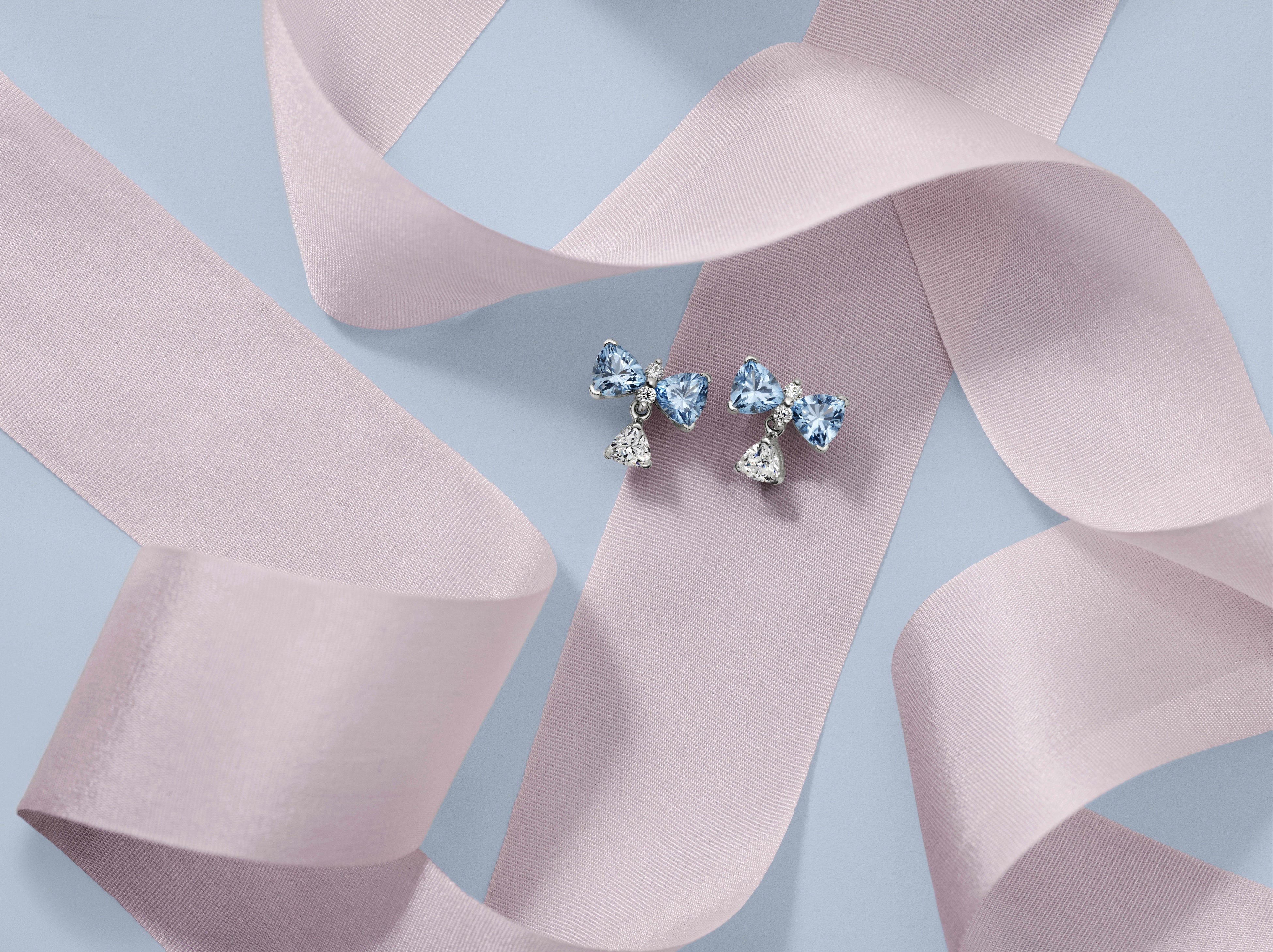 リボンモチーフのピアスは、耳元を沿うように広がるデザインにブリジャートン家らしいリボンが華やかな表情を与えています。スターリングシルバーで作られ、それぞれにブルーの人工クリスタルをあしらっています。さらにロマンチックな雰囲気を添えるため、中央には輝くキュービックジルコニアが揺れています。