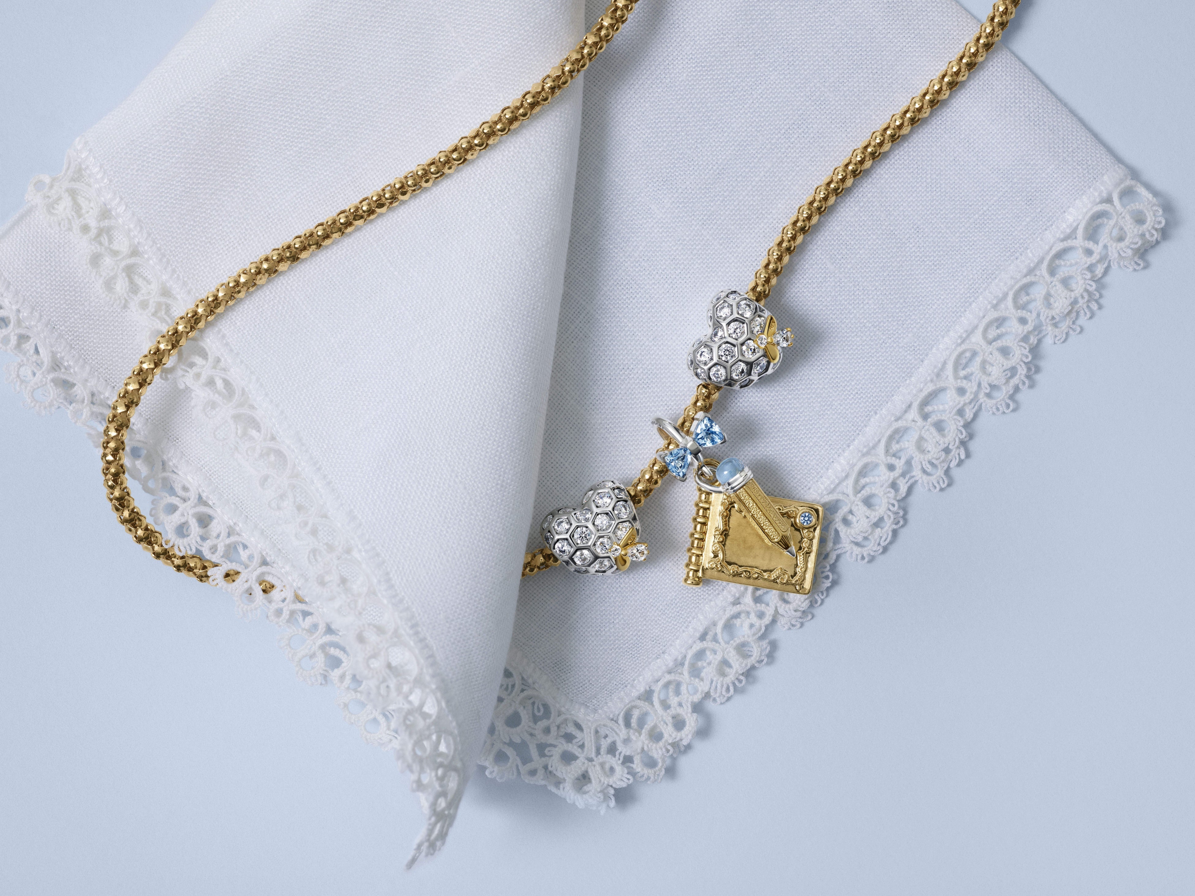 物語の語り部であるレディ・ホイッスルダウンを想起させる、英国らしいユーモアあふれるティーバッグチャームもラインアップされています。スターリングシルバーと14Kゴールドプレーティングで仕上げたティーバッグのチャームは、ブリジャートン家の優雅できらめきに満ちたスタイルを演出。輝くキュービックジルコニアと「Tea Time」と刻まれたタグが、時を超える魅力を添えます。