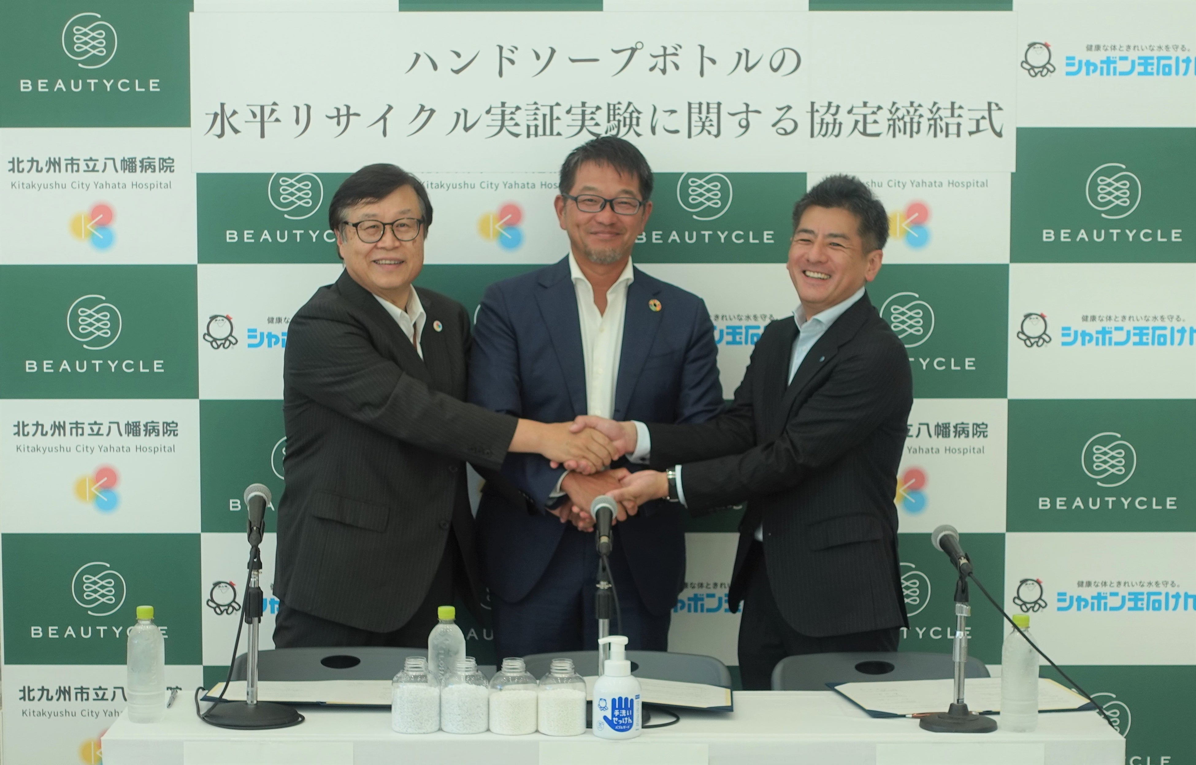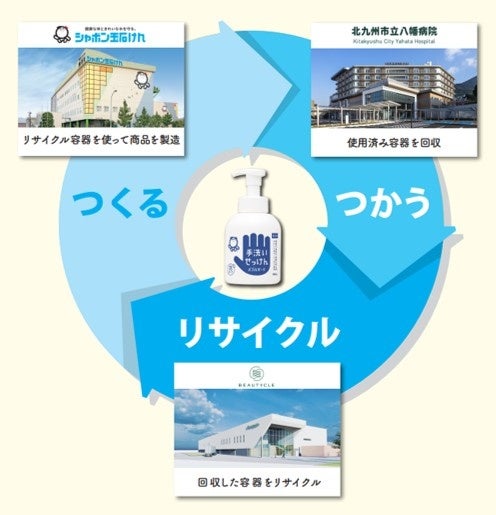 シャボン玉石けんのハンドソープ「手洗いせっけんバブルガード」は北九州市立八幡病院内で利用されていますが、病院という衛生管理がより必要とされる環境において、詰め替え用の商材は使用せず、使用後はボトルごと処分し、新しい商品を使用していました。今回の協定締結により、使用済みボトルを佐賀県内のBEAUTYCLE工場にてリサイクルし、新たな「手洗いせっけんバブルガード」のボトル原料として生まれ変わらせます。