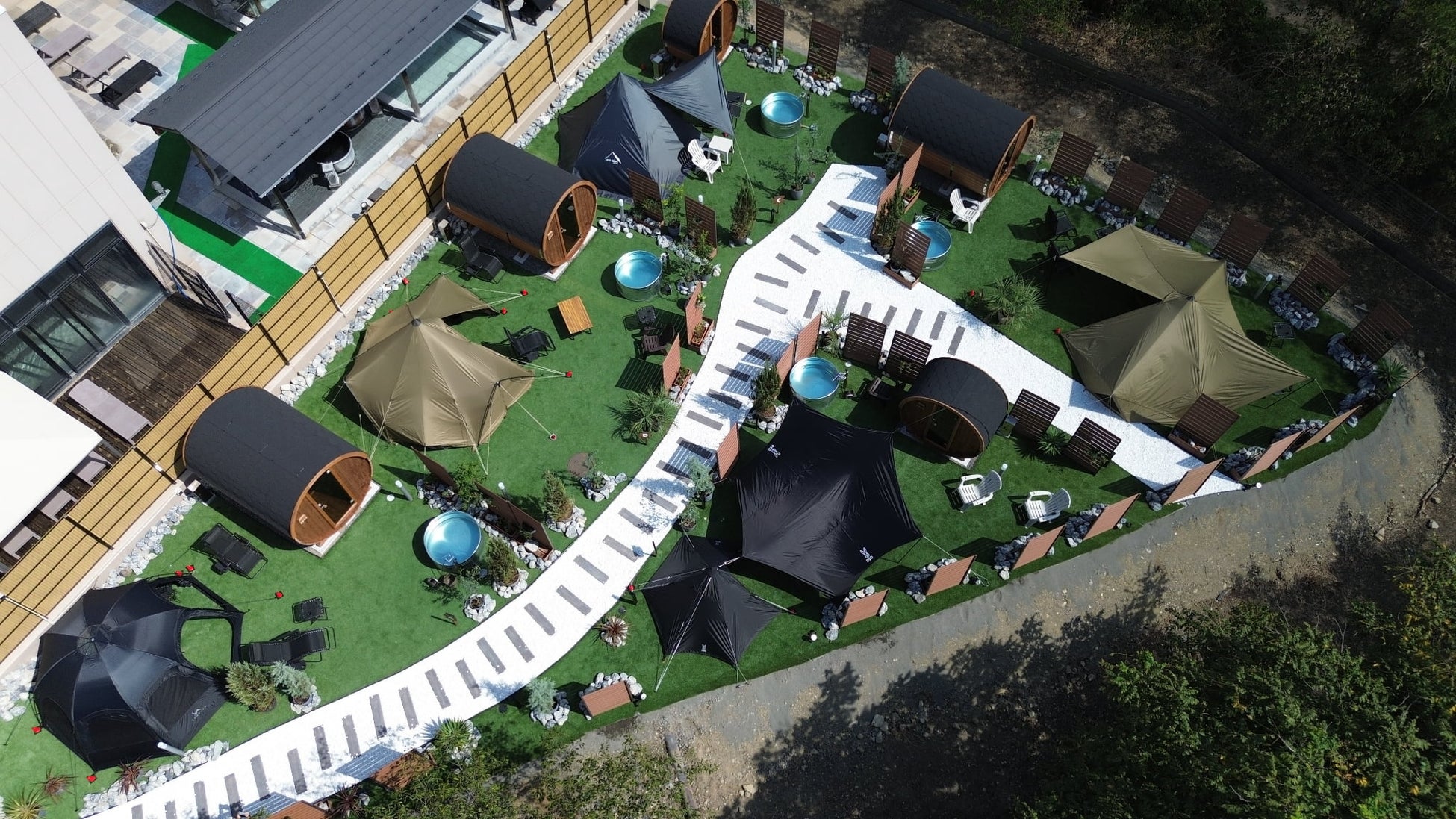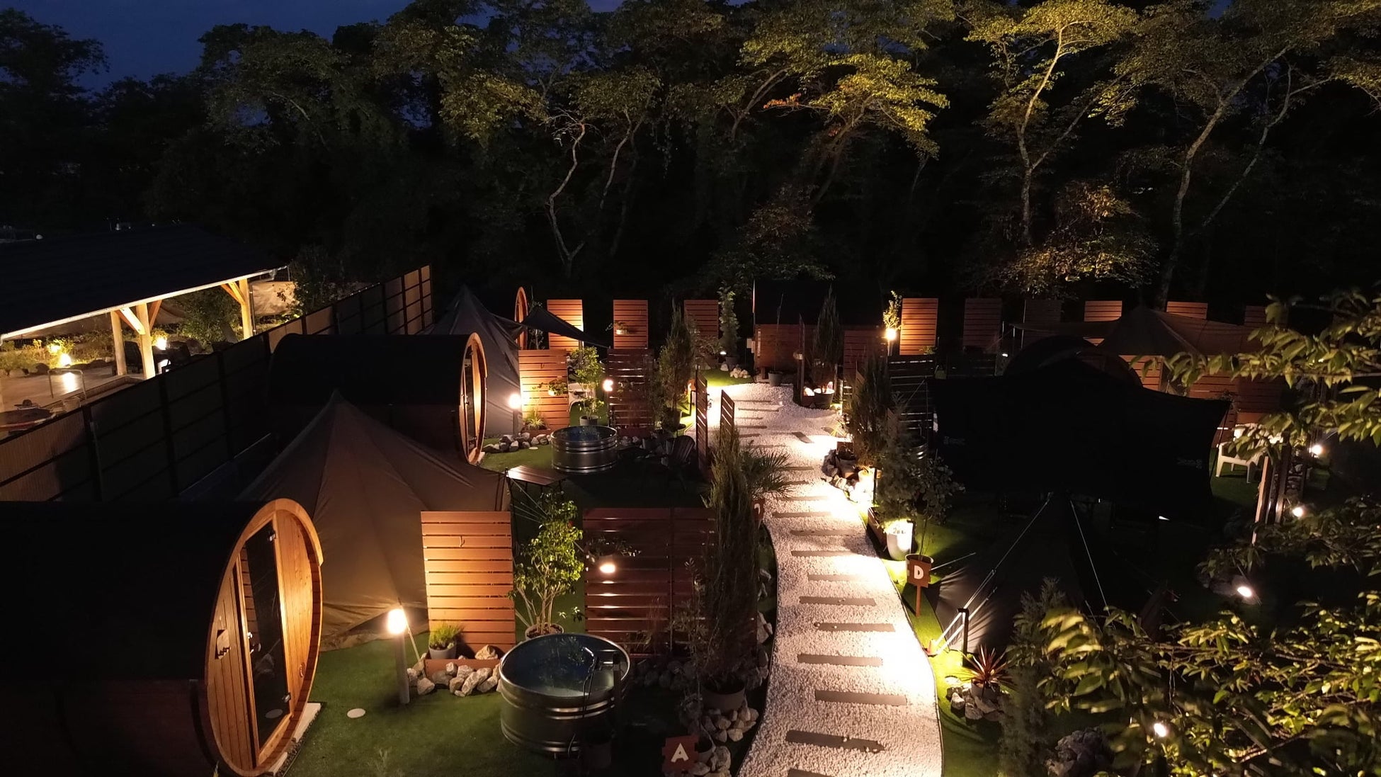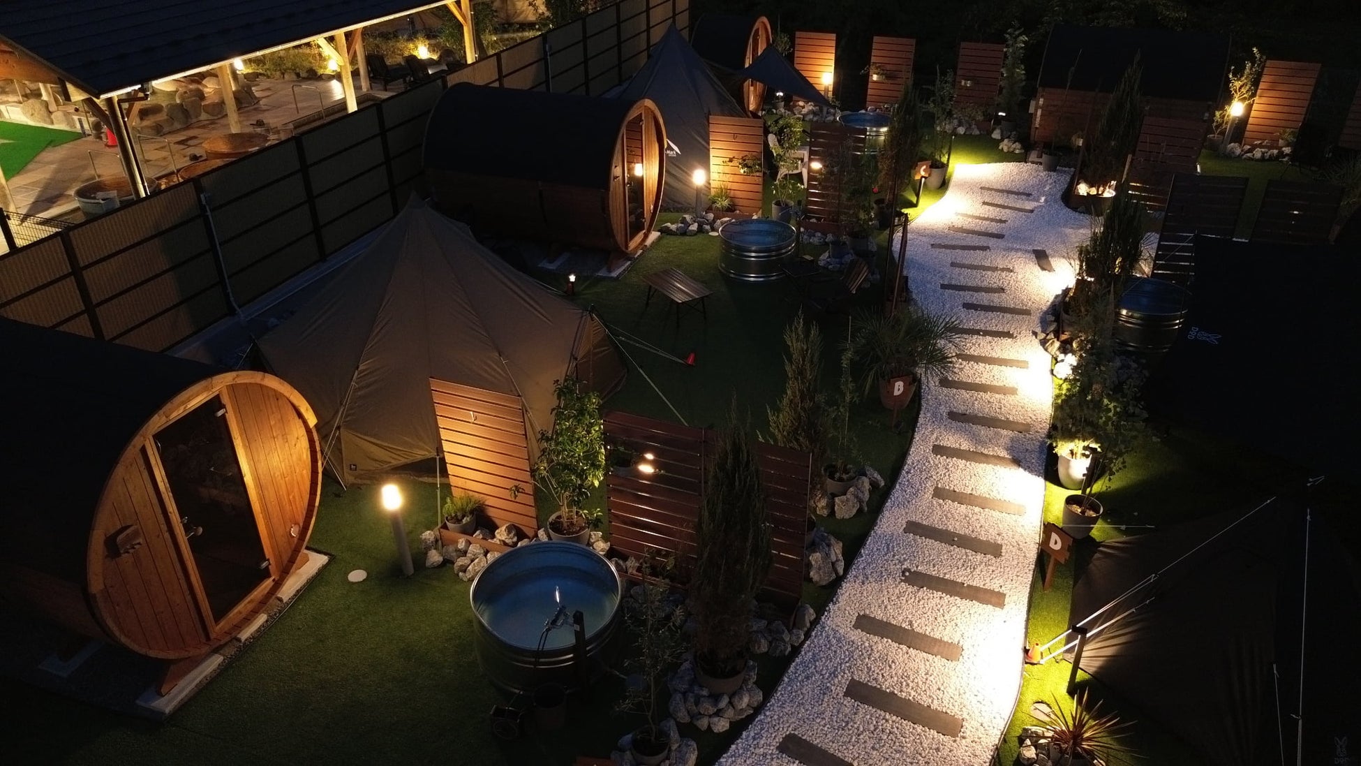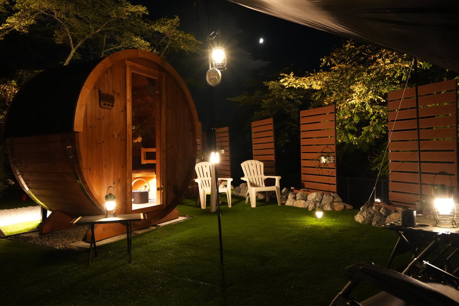 昼間は青空と緑が織りなす爽快な景色を楽しみ、夜には、周囲の自然が柔らかい照明に照らされ、幻想的な雰囲気が広がります。バレルサウナ内の温もりと、外の冷たい夜風のコントラストを感じながら、日常の喧騒から離れた贅沢な時間をお過ごし頂けます。静寂と光が融合する夜のバレルサウナは、まさに非日常と言えます。また、各サイトに設置したシェルター型テントの下で楽しむ「雨の日のサウナ」もこれまた非日常を味わう絶好の機会となっております。