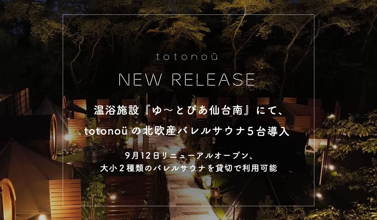 totonou Japan株式会社(本社:東京都渋谷区、代表:齋藤アレックス剛太、以下「totonoü(ととのう)」)は、株式会社ベガスベガス(本社:東京都中央区、代表取締役社長:高橋秀之、以下「ベガスベガス」)が9月12日(木)にリニューアルオープンした温浴施設『ゆ~とぴあ仙台南』(宮城県仙台市、以下「本施設」)にて、北欧産のバレルサウナ製品が5台導入されたことを発表します。