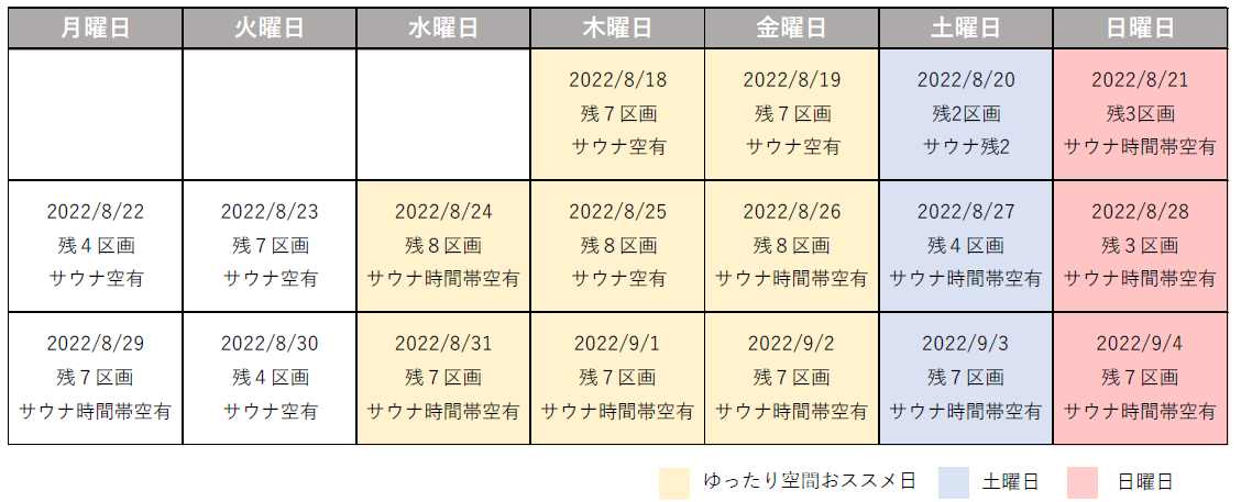 土日は徐々に埋まりつつ有りますが、平日は空きが有り、よりゆったりとした空間でBBQ・CAMPを楽しむことが可能です。サウナのお客様が居なければ海の目の前に設置れている、インフィニティチェアを独り占め、雄大な海を眺めながら波の音を心地よく聞きながら読書・ゆったりする事が出来るので、平日は特におススメです!