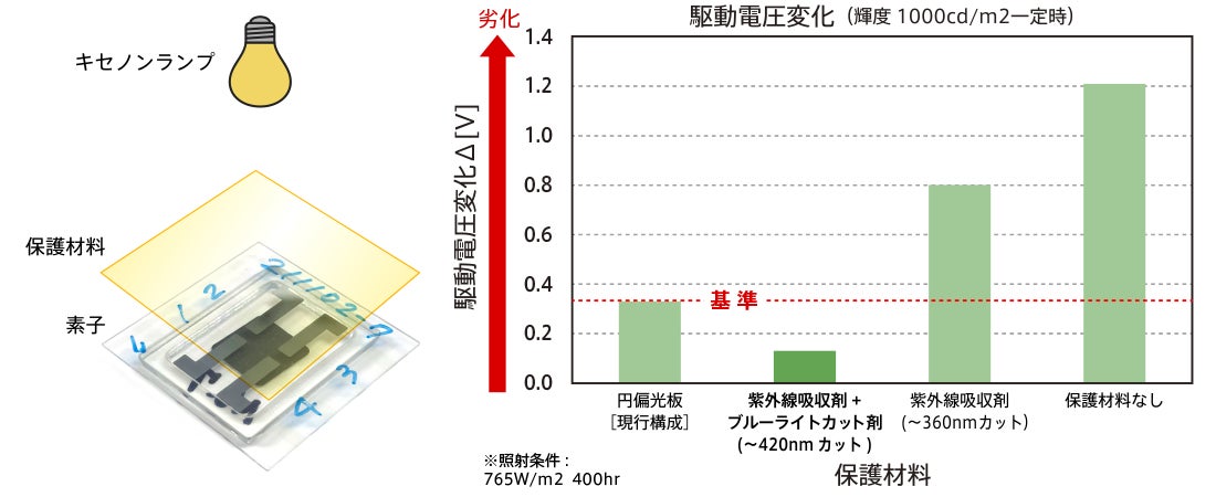 有機EL素子は一般的に劣化が進むにつれ同じ輝度を得る際の駆動電圧が上昇します。保護材料の違いによる素子の劣化を比較するため、青色有機EL素子をそれぞれ円偏光板、汎用の紫外線吸収剤、ブルーライトカット剤を用いて保護し、耐光性試験を実施しました。なお、素子の作製と劣化評価は、山形大学有機エレクトロニクスイノベーションセンター結城敏尚准教授の協力のもとに実施しました。
