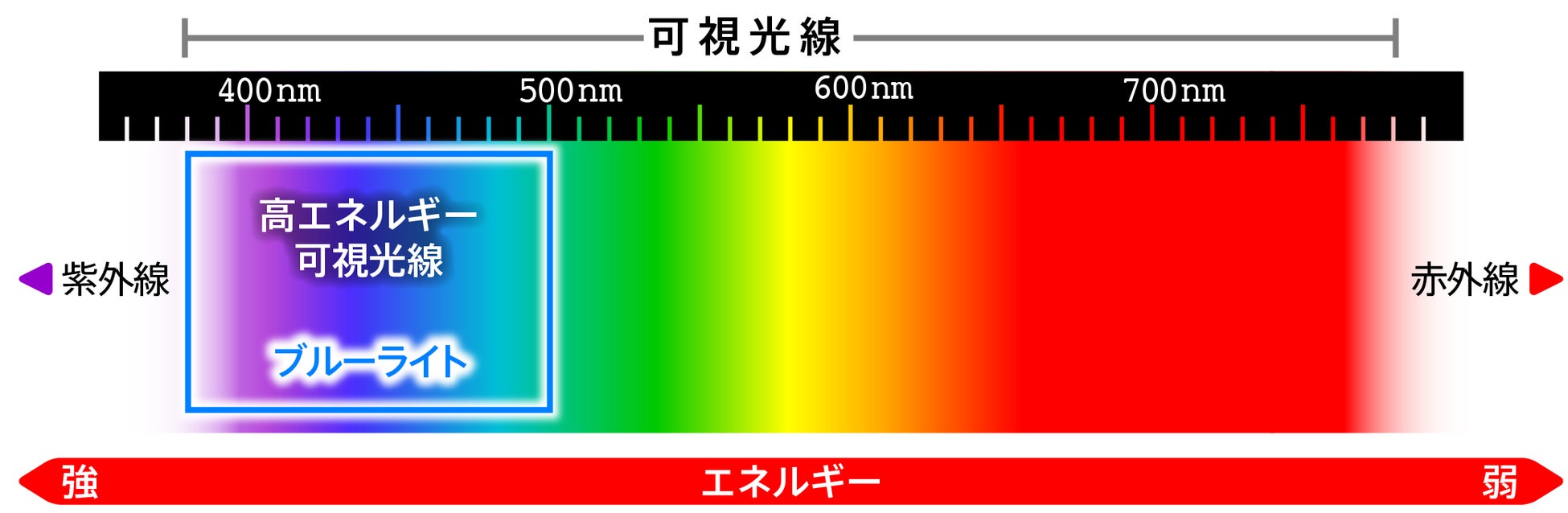 ブルーライト(380~500nm)は可視光線の中で波長が短く、比較的強いエネルギーをもつ光です。紫外線(~380nm)が有機物を劣化させることは広く知られていますが、ブルーライトもまた、紫外線と同様に素材を劣化させることが指摘されはじめています。