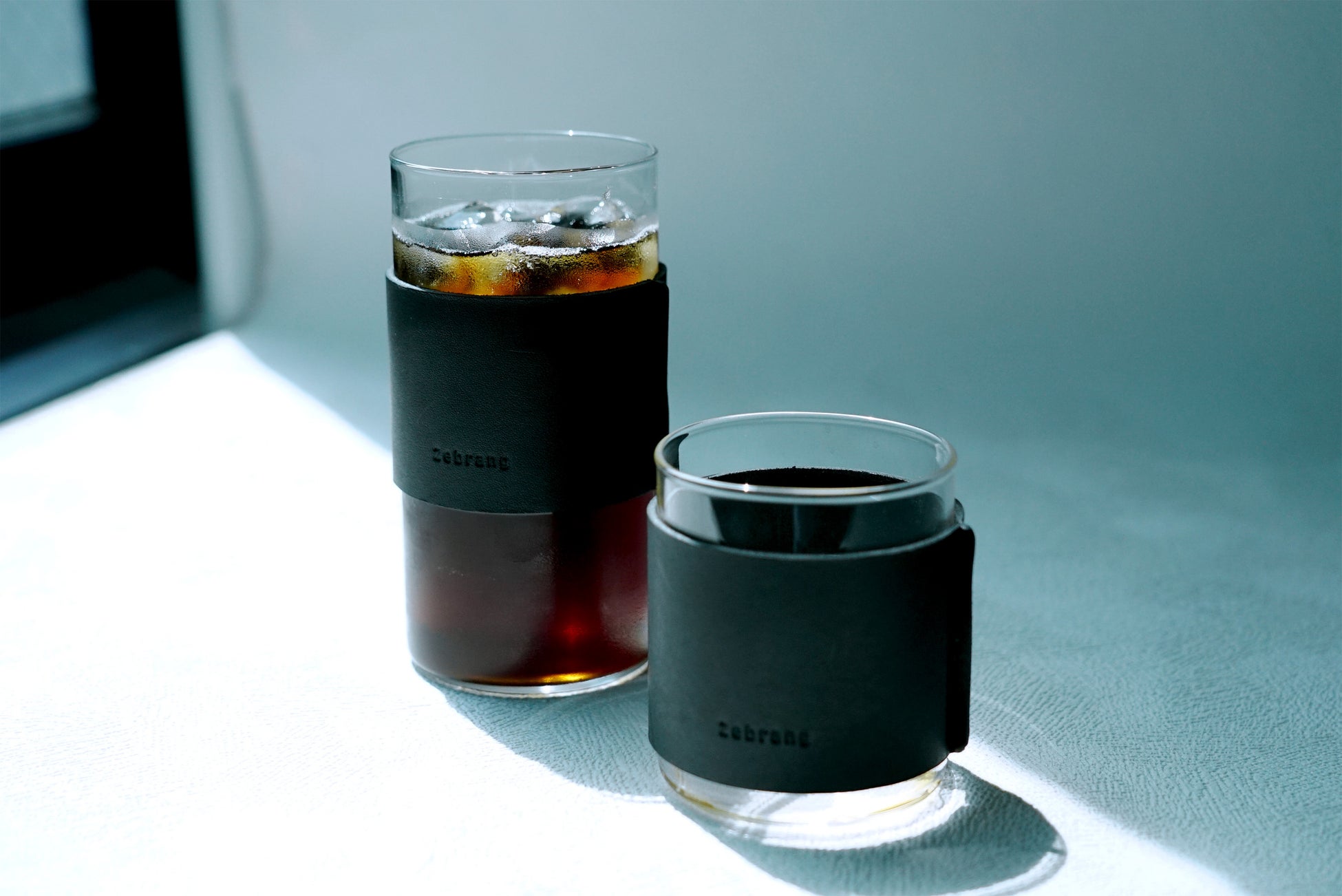 イタリアンレザーのスリーブと耐熱ガラスグラスのセット。グラスも特別な装いを纏えば、いつものコーヒーシーンが最高に価値ある体験に進化します。