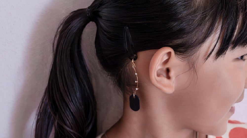 マイヤリングは髪に留める構造で、チェーンやモチーフが自然に耳元に沿って揺れるデザイン。耳への負担が少なく、小さなお子さまでも安心して身に着けられます。イヤリングの痛みやピアスホールの有無に悩むことなく、「お子さまから大人の方まで、すべての人におしゃれの自由を届けたい」という想いから生まれました。