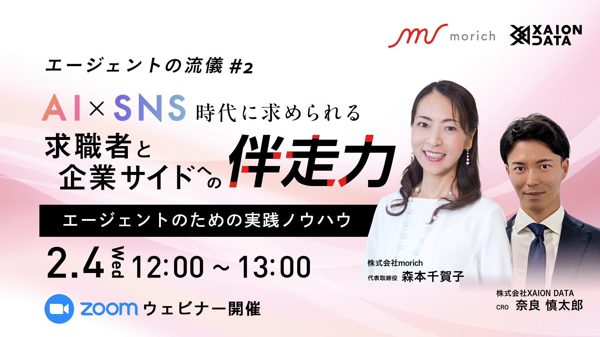 株式会社XAION DATA(本社:東京都千代田区、代表取締役:佐藤 泰秀)の運営する転職潜在層へのアプローチSaaS「AUTOHUNT(オートハント)」は、株式会社morich(本社:東京都中央区 代表取締役:森本千賀子)との共催セミナー「エージェントの流儀 #2─AI×SNS時代に求められる求職者と企業サイドへの伴走力」を開催いたします。本セミナーでは、AI×SNSを活用し、求職者理解を深めながら企業との連携を強化することで、“成果につながる伴走力”を高める実践ステップを、リアルな事例とともに徹底解説します。