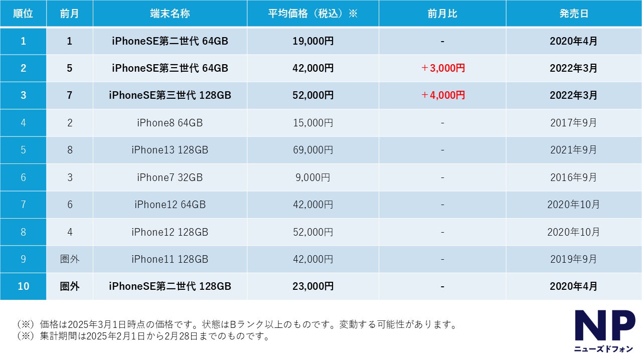 2025年2月度、中古iPhone販売数ランキングトップ10(ニューズドフォン調べ)