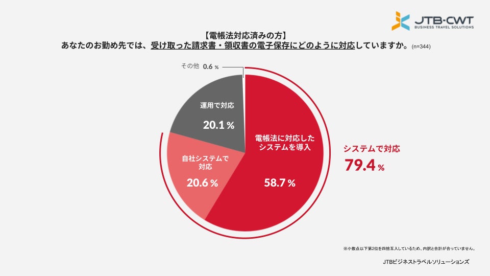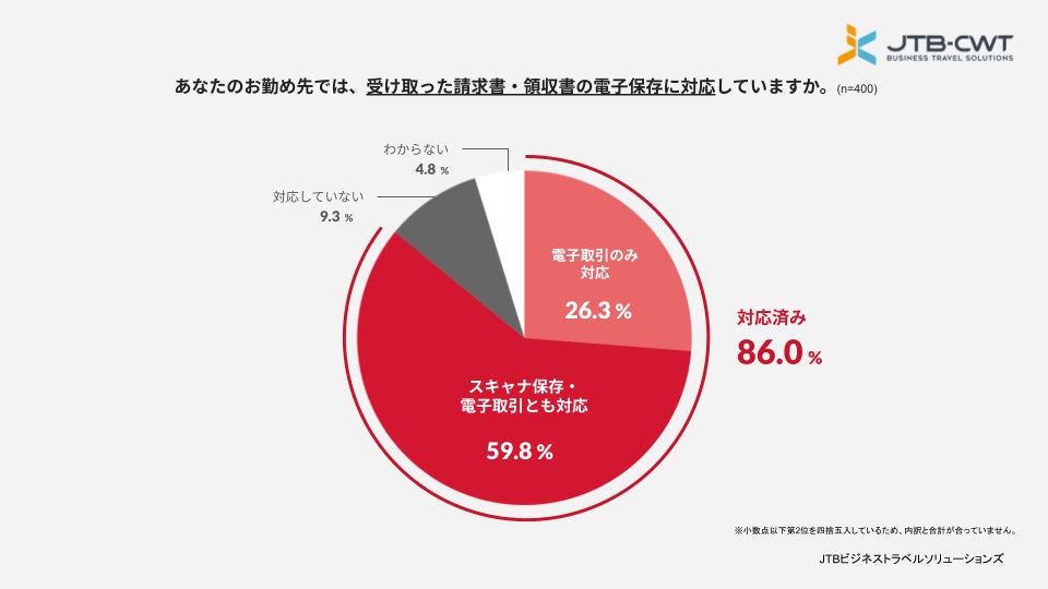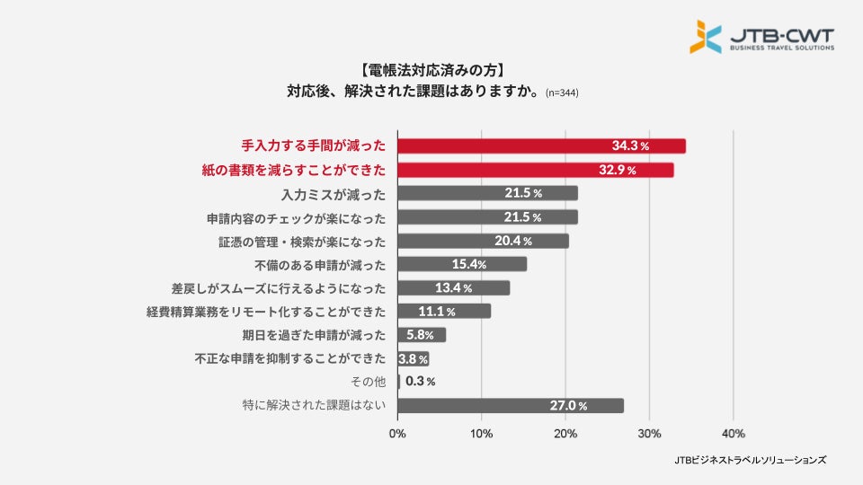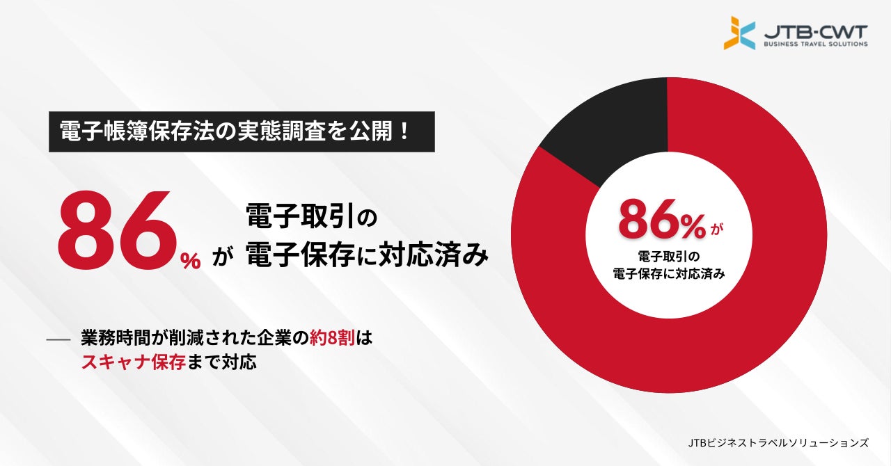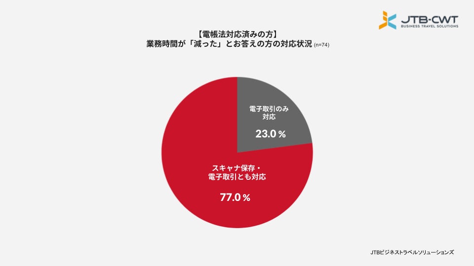 JTBグループで経費精算・出張管理システム『J’sNAVI NEO(ジェイズナビネオ)』を提供する株式会社JTBビジネストラベルソリューションズ(本社:東京都江東区、代表取締役社長執行役員:原田 雅裕、以下「JTB-CWT」)は、企業の会計・経理・財務担当者を対象に「電子帳簿保存法施行後の実態調査」を実施いたしました。