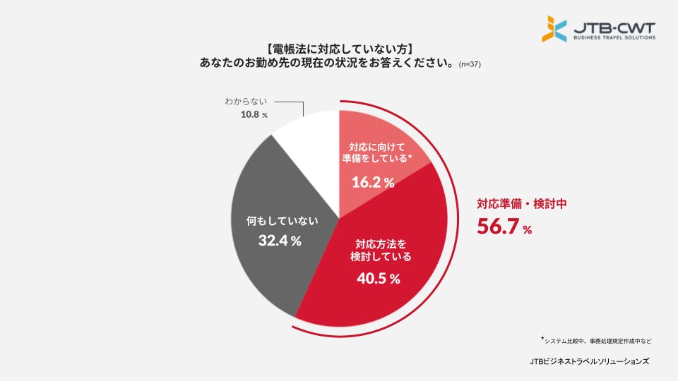 図3で示している通り、電帳法未対応の企業であっても、「対応に向けて準備を進めている(16.2%)」「対応方法を検討している(40.5%)」と、56.7%の企業では電子取引の電子保存に向けて何らかの動きを始めている状況であることがわかりました。