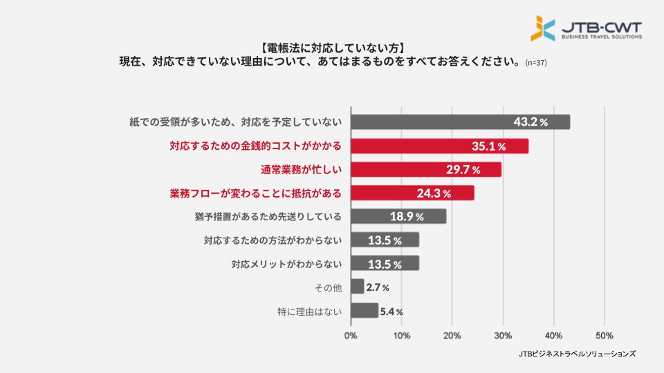 また、図4の通り、電帳法に対応していない理由について、「紙での受領が多いため、対応を予定していない」と回答した企業が43.2%いる一方で、「対応するための金銭的コストがかかる(35.1%)」や「通常業務が忙しい(29.7%)」「業務フローが変わることに抵抗がある(24.3%)」との回答も多くみられました。対応を予定しているにも関わらず、費用や時間を確保できない企業も多いことがうかがえます。