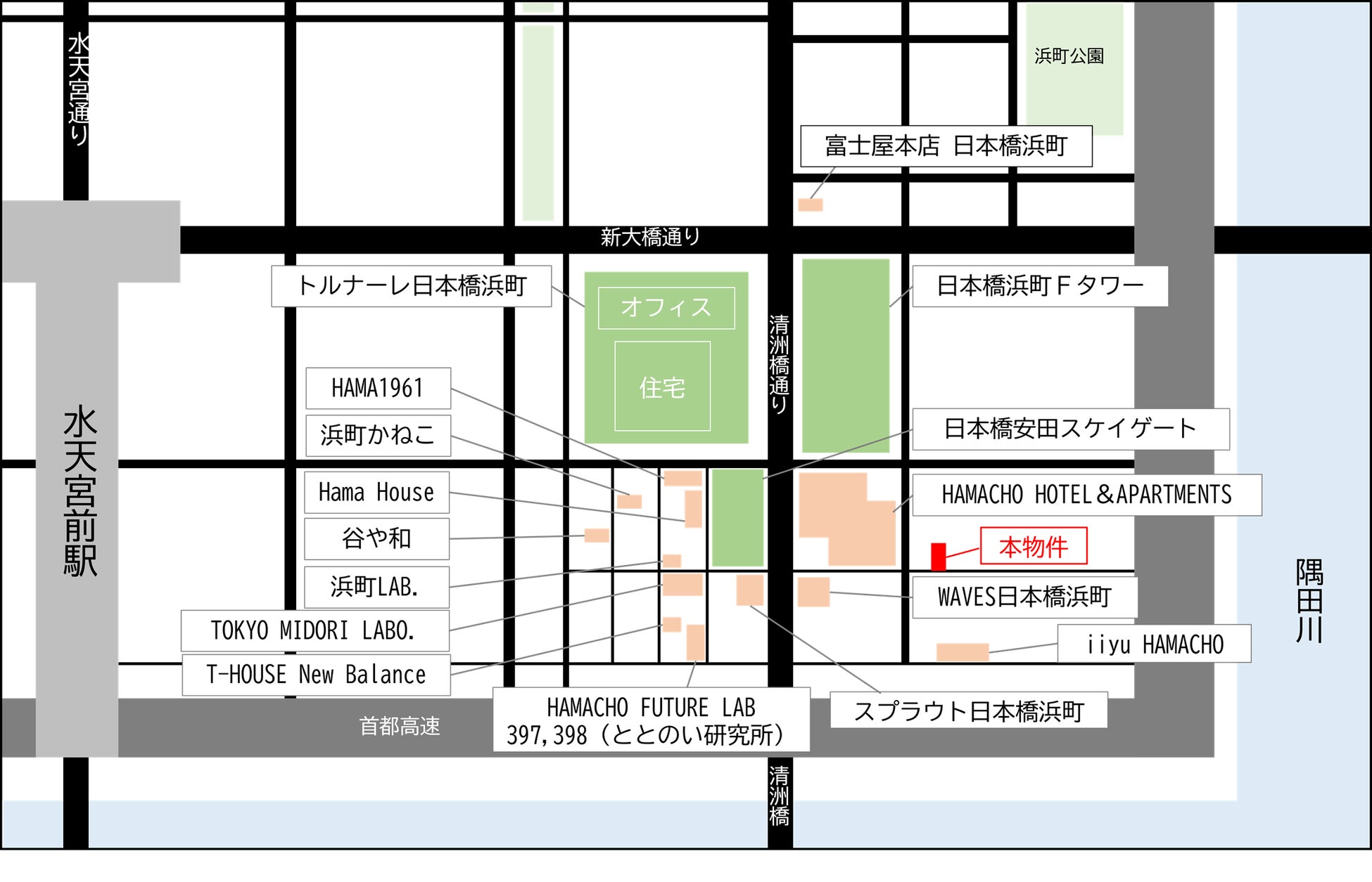 当社は、日本橋浜町において、“住み続けられ、働き続けられるまちづくり”を目指し、「日本橋浜町Fタワー(1997年)」、「トルナーレ日本橋浜町(2005年)」等の大型オフィスビルや住宅を開発し、2015年から、エリアの差別化を図るため、まちづくりコンセプトを“「手しごと」と「緑」の見えるまち”と定め、日本橋浜町でしか体験できない路面型店舗を開発誘致しています。大規模再開発(面開発)ではなく、中小規模開発(点開発)にて路面型店舗を継続して開発誘致することで、エリアの魅力や活力の向上を図ってきました。2015年度開業の「浜町かねこ」「谷や和」「富士屋本店日本橋浜町」に始まり、2019年には、新しい文化・コミュニティを創出する場として複合施設「HAMACHO HOTEL&APARTMENTS」、2020年には「T-HOUSE New Balance」、2022年には「Shingle O hamacho」の開発等を行いました。これらの取り組みにより、地域住民やワーカーの生活拠点となるだけでなく、国内外から多くのゲストを迎え入れることに繋がっています。