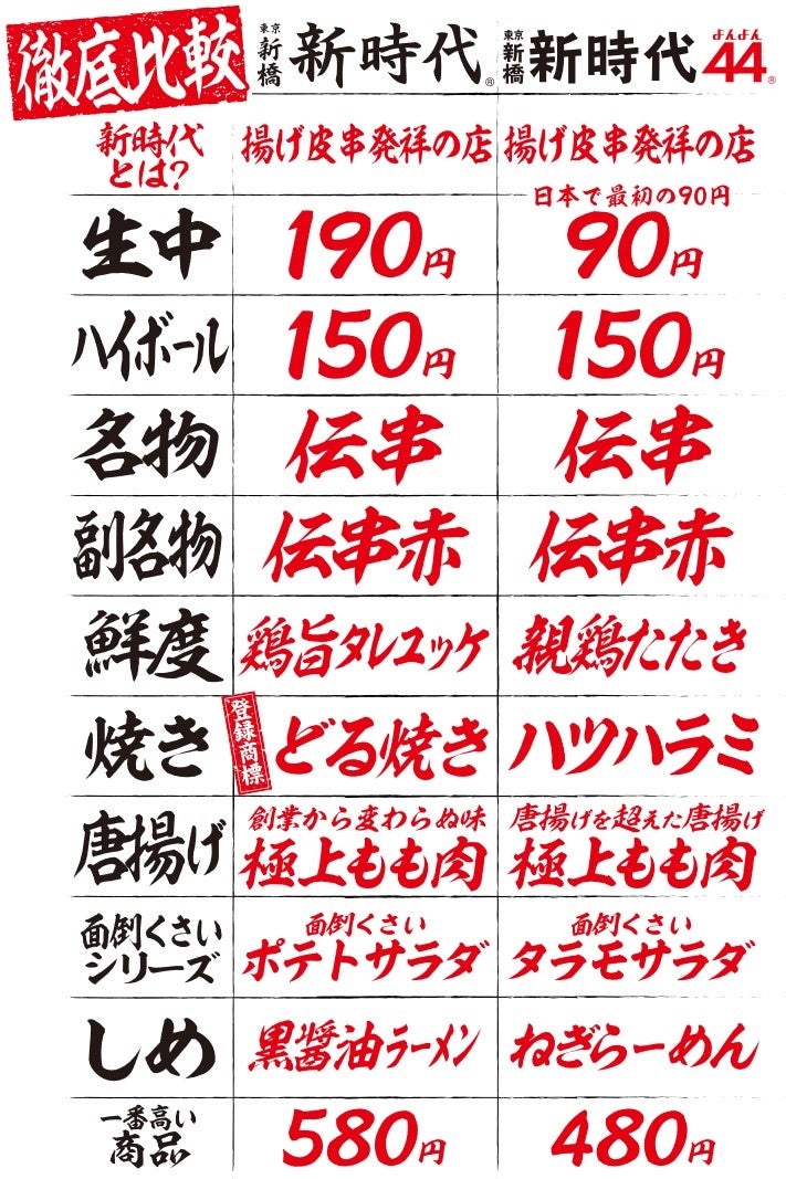 共通メニューは、名物の『伝串』と、その他数品のみ。そのため、『新時代』と『新時代44』が隣同士に存在する秋葉原・新橋・虎ノ門や、200m圏内に存在する名古屋(錦)では、2つのお店を月に何度もローテンションするお客様が多くみられます。『新時代通り』という名前でSNS上でも話題を集めております。