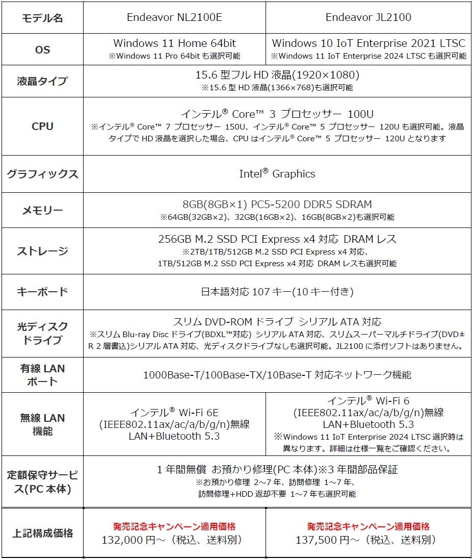 『Endeavor NL2100E』シリーズの仕様一覧および詳細は、ホームページでご確認ください。