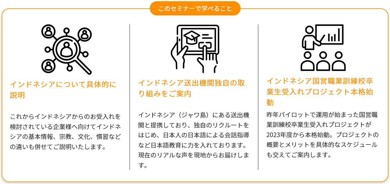 当セミナーでは、インドネシア送出機関(株)IJFAの世羅陽一朗氏を招き、インドネシア人材の受け入れについて解説するほか、「インドネシア国営職業訓練校卒業生受入れプロジェクト」についてもご説明いたします。