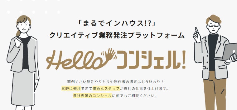Helloコンシェル!は、クリエイティブ関連の制作業務をバナー広告からプロジェクト全体まで、あらゆる制作を一括で発注できるプラットフォームです。省人化が進むマッチングプラットフォームでは珍しく、人材(コンシェルジュ)を配置しています。