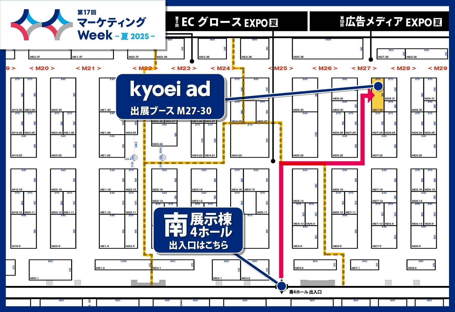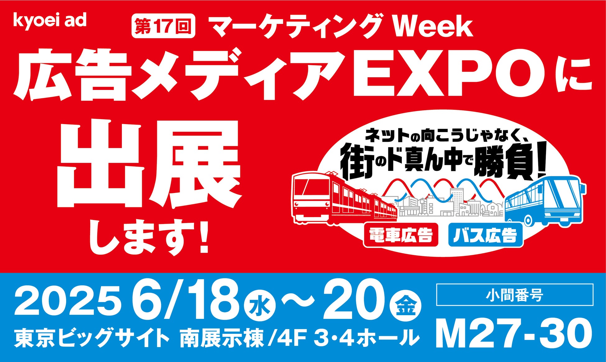 全国でエリアマーケティング事業を展開する株式会社キョウエイアドインターナショナル(本社:東京都千代田区 代表取締役:廣瀬勝巳 以下「キョウエイアド」)は、2025年6月18(水)〜20日(金)に、東京ビッグサイト南展示棟で開催される「第17回 JapanマーケティングWeek2025【夏】 広告メディアEXPO」に昨年に引き続き出展し、交通広告の特長や魅力を発信します。