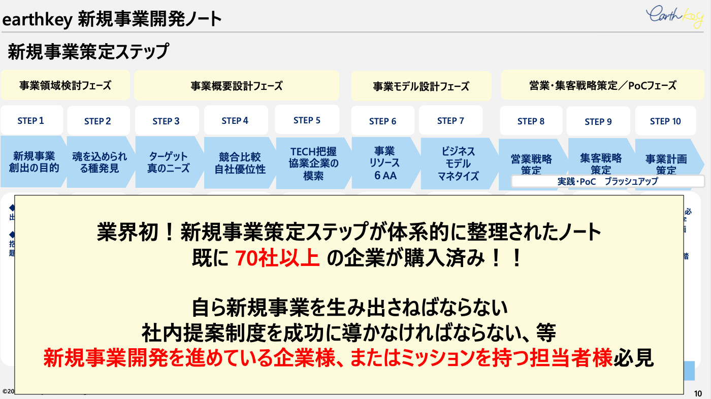 これまでプレスリリースや目立ったPRを行わない中、「大手企業を中心に70社以上」からご購入いただいております。そんな「earthkey新規事業開発ノート」がこの度パワーアップし、VOL.4をリリースいたします。