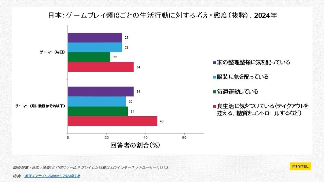ミンテルが実施した「ゲームプレイ頻度と生活行動の関連性」調査によると、ゲームのプレイ頻度によって生活習慣に顕著な違いが現れることが判明しました。