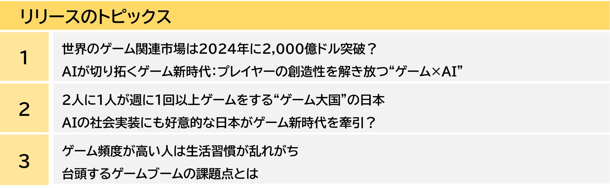 本レポートでは、世界のゲームトレンド、AI活用の現状、そして日本のゲーム市場が直面する課題について、記載しています。