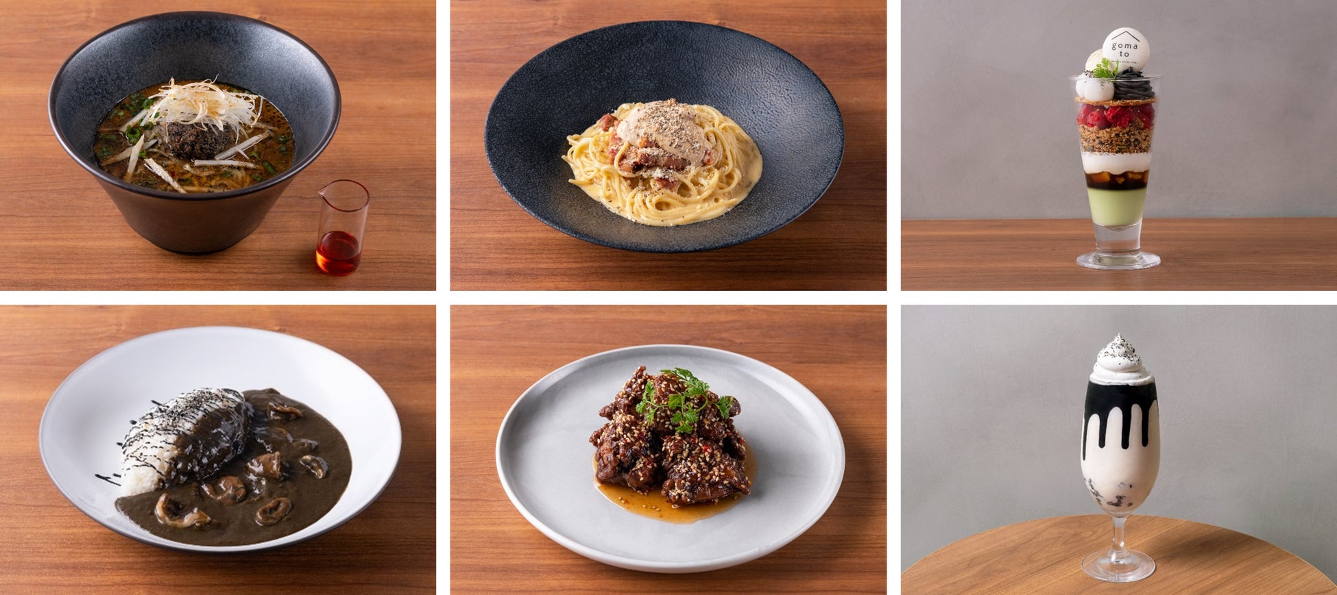 スープやトッピングにふんだんに黒ごまを使った「ごま油香る黒ごま担々麺」や、白ごまや白ねりごまをたっぷり使ったコクのある濃厚なソースが決め手の「白ごま豆乳カルボナーラ」、黒ねりごまとイカ墨を組み合わせた奥深い味わいの「黒ごまシーフードカレー」、そしてお酒のおつまみにもぴったり、ごま油の香りが食欲をそそる「唐揚げのスイートごまチリソース和え」など、ご来店後にもごまをお楽しみいただけるよう、ご家庭のお料理のヒントとなるお食事のラインナップを揃えます。さらに、昨年‘goma to1周年アニバーサリー’を記念して発売し大好評いただいた期間限定メニューの「goma toパフェ」と「黒ねりごまと自家製わらび餅のバニラシェイク」が、再販の声を多数いただき再登場いたします。ごまづくしの新メニューを是非お楽しみください。