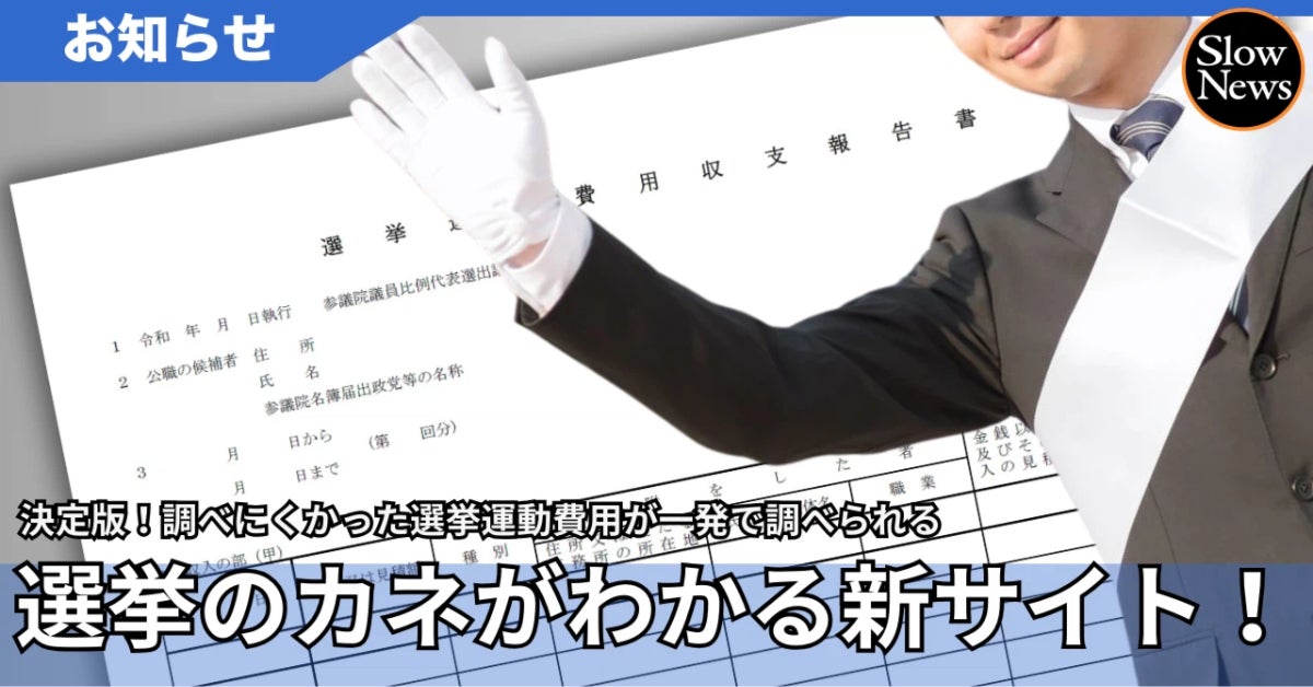 スローニュース、選挙運動費用を検索・閲覧できるサイトを公開 前回衆院選(2021年10月)の「選挙運動費用収支報告書」を全件集約