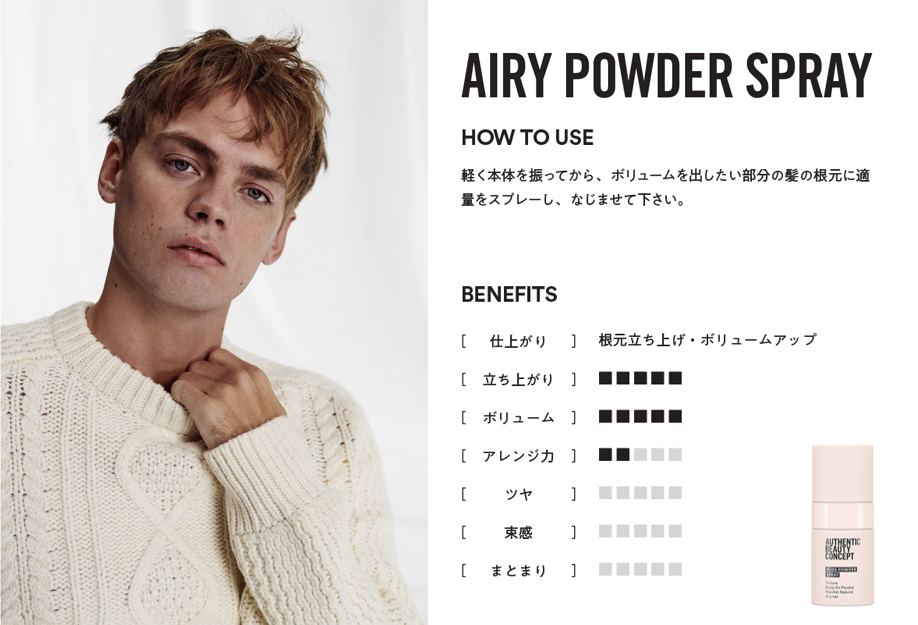 霧のように細かいパウダーが髪の根元を立ち上げ、ボリュームのあるドライな仕上がりを実現します。