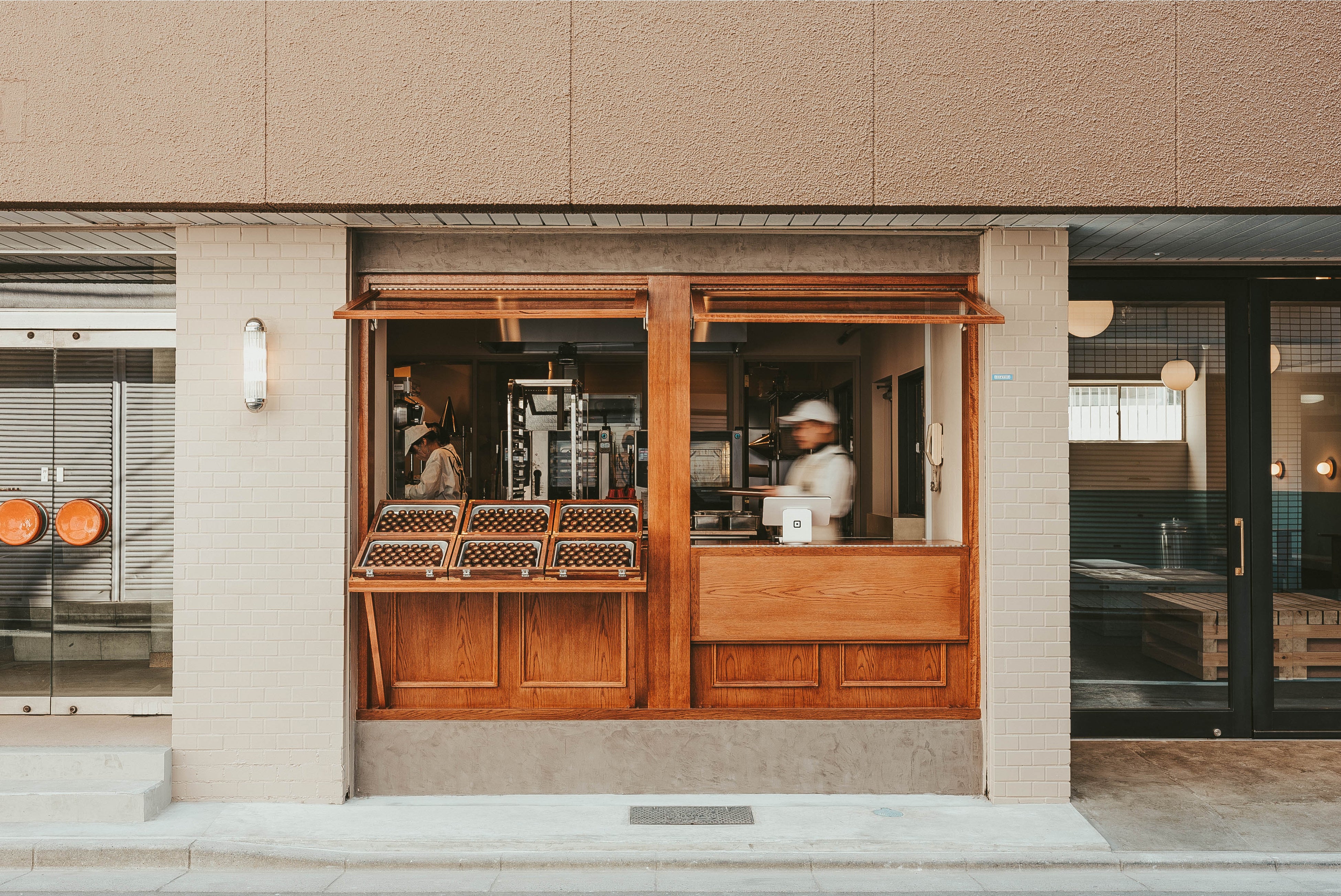 併設された工房で焼き上げる、焼き立てのカヌレ「クラマエ・カヌレ」やカヌレを合わせたソフトクリームなどをテイクアウトとして販売するカウンターになります。一般的に焼き上げた後冷まして常温で提供するカヌレを、「KURAMAE CANNELE」では、あえて焼き立てで提供することにこだわりました。