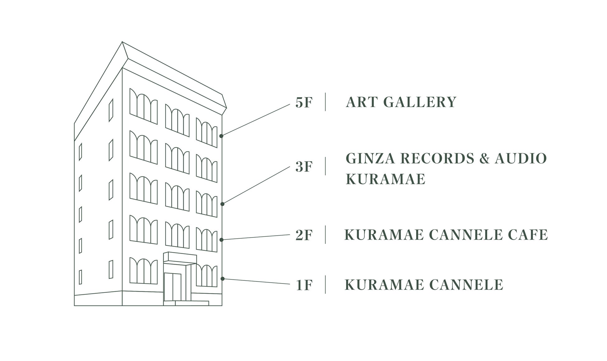 本店舗はカフェに加え、音楽やアートが楽しめる5階建ての複合施設です。1階は併設工房で焼き上げた焼き立てのカヌレ「クラマエ・カヌレ」を販売するテイクアウトカウンター、2階は当店舗でしか味わえない”カヌレ専用卵”を使用したプレミアムカヌレのスイーツプレートを提供するカフェ、そして3階はレコードのみならず自身に合った音響機器をお楽しみ頂けるレコード店となっています。さらに5階はアートギャラリーとしてご使用頂けます。