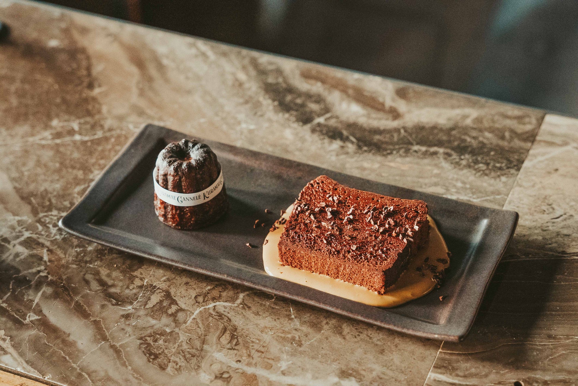 「グランカヌレ&2層のショコラテリーヌ ソース・アングレーズ・カフェ カカオニブ」(1,480円)