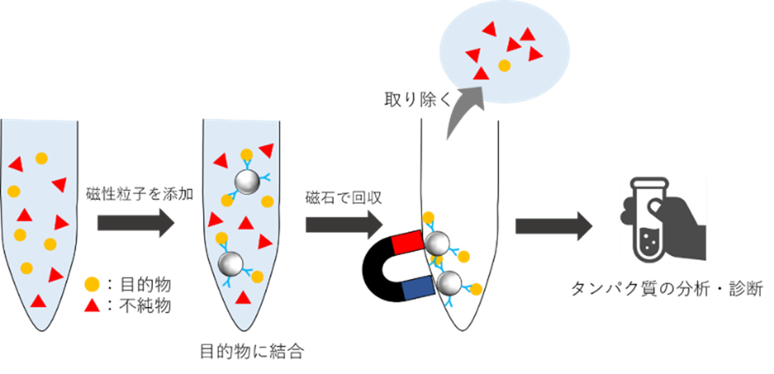 この粒子は従来品よりも多くのタンパク質を回収できるため、動物や人への負担を軽減し、今後の診断薬分野への貢献が期待できます。