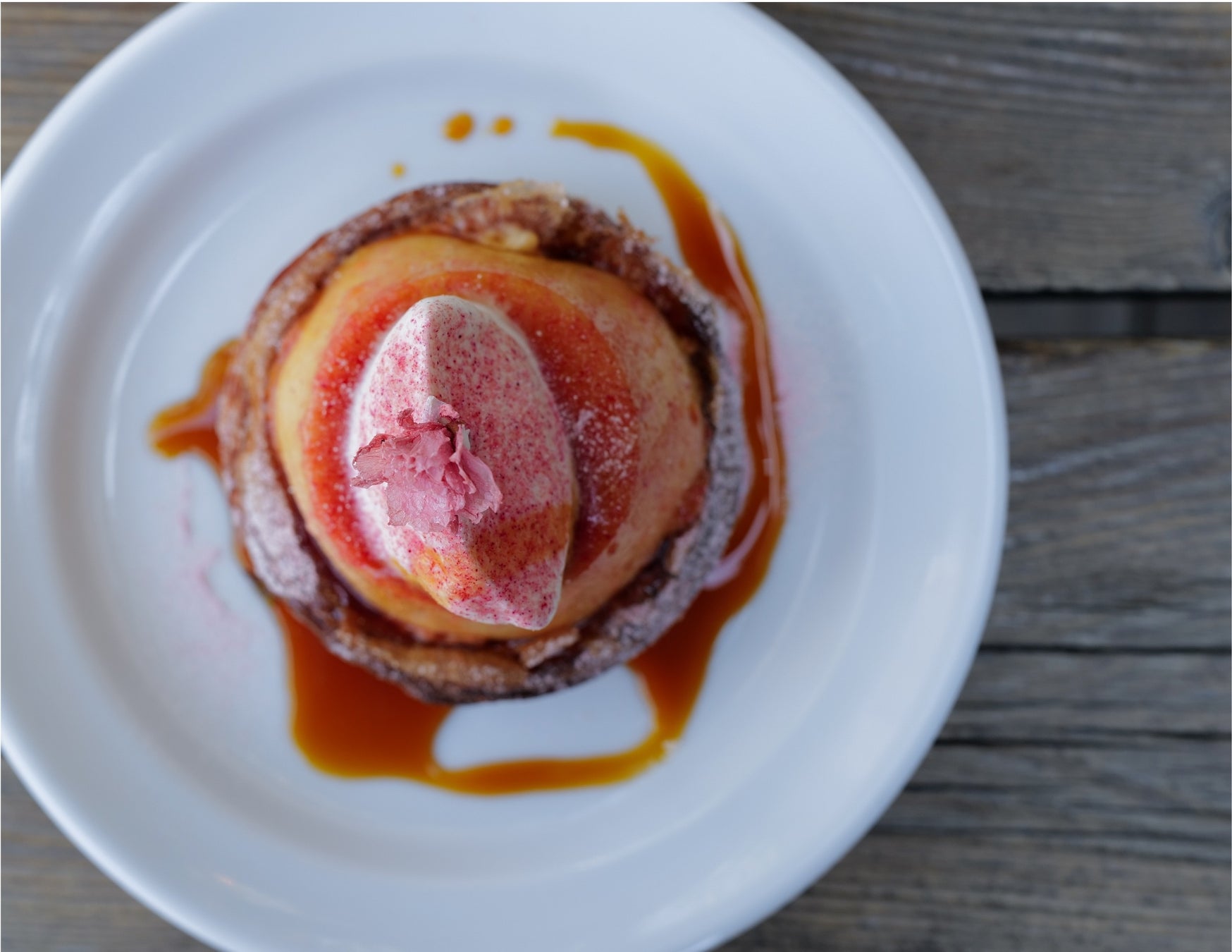 16層に折り込まれたバターの香るクロワッサン生地で作る、GHCの人気商品「エッグタルト」を特別に2倍サイズの大きさにしました。そこに存在感たっぷりなクラシックプリンを乗せることで、クロワッサン生地のバリバリな食感と、プリンのぷるんぷるんでもっちりとした食感を同時にお楽しみいただけます。甘さのあるアパレイユを引き立てるため、プリンはあえてシンプルな味に仕立てています。お好みでほろ苦いカラメルをかけることで、さらに味の奥行き感を演出します。プリンの上には、生クリームと桜パウダー、桜の花びらをあしらうことで華やかな春の装いに仕上げています。