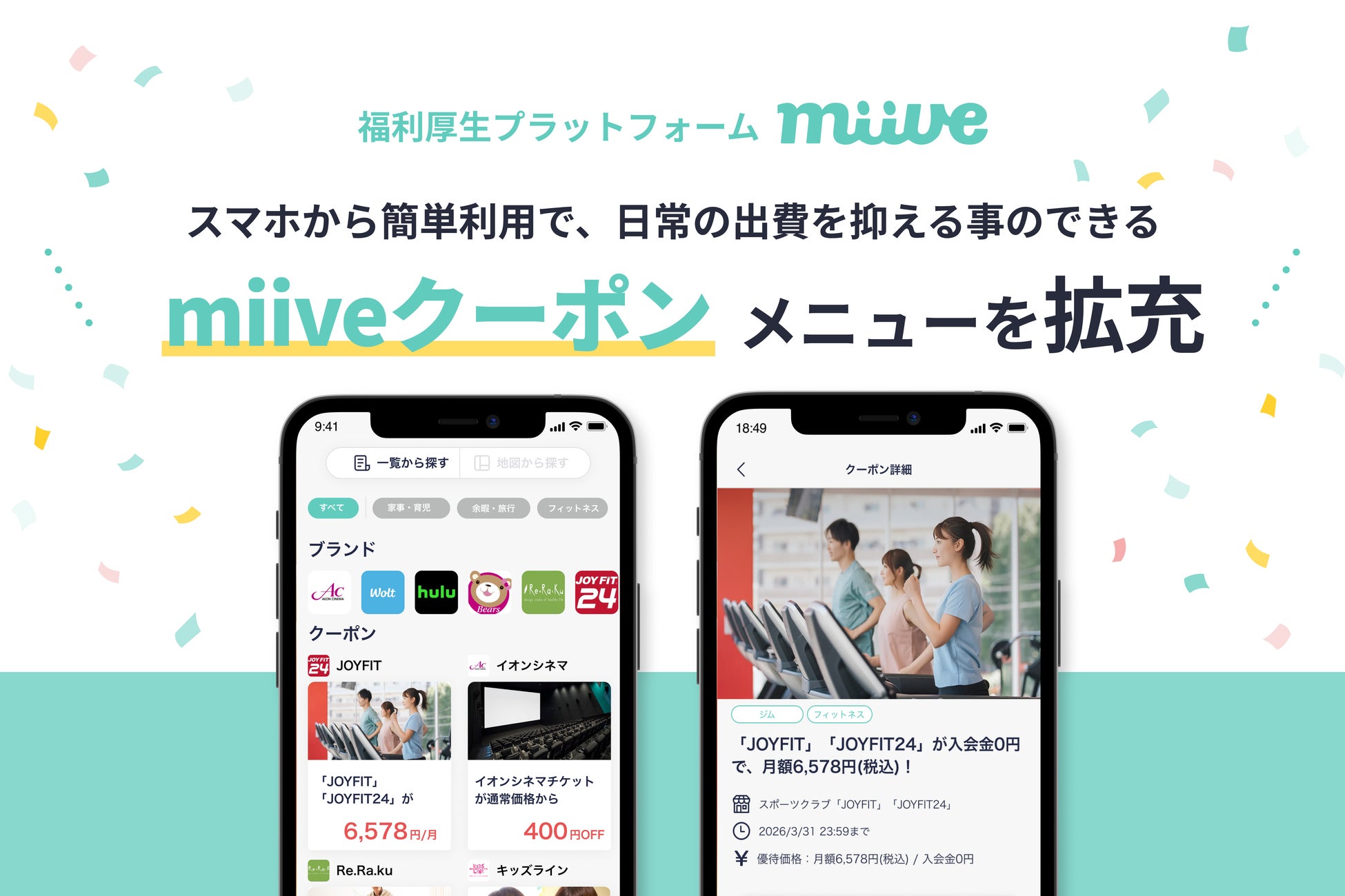 株式会社miive(本社:東京都渋谷区、代表取締役CEO:栗田廉)は、福利厚生プラットフォーム「miive」における従業員優待サービス「miiveクーポン」において、ビジネスウェア・ライフスタイル領域を中心に対象を拡充したことをお知らせいたします。今回の拡充により、miiveクーポンは食事・映画・ファッション・趣味・健康など、従業員の日常に寄り添った幅広いジャンルで利用可能となりました。