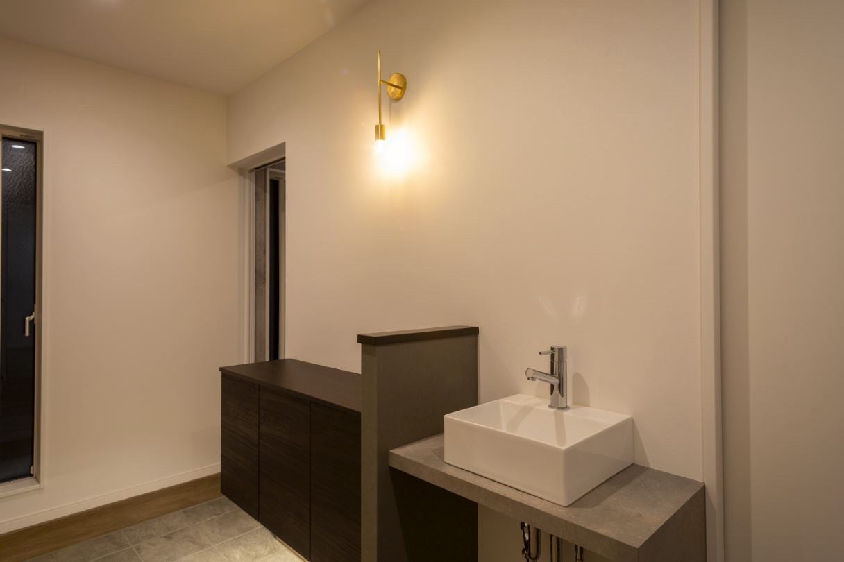 玄関エントランスの手洗いボウルの横に立ちあがった腰壁にFeボード(マグネット仕様のボード)を採用しました。ペーパータオルのホルダーをマグネットで壁に取付けることで、カウンターから浮かせることができ、清掃性&清潔感◎。クロス仕上げなので見た目にも分からずスッキリお洒落です。