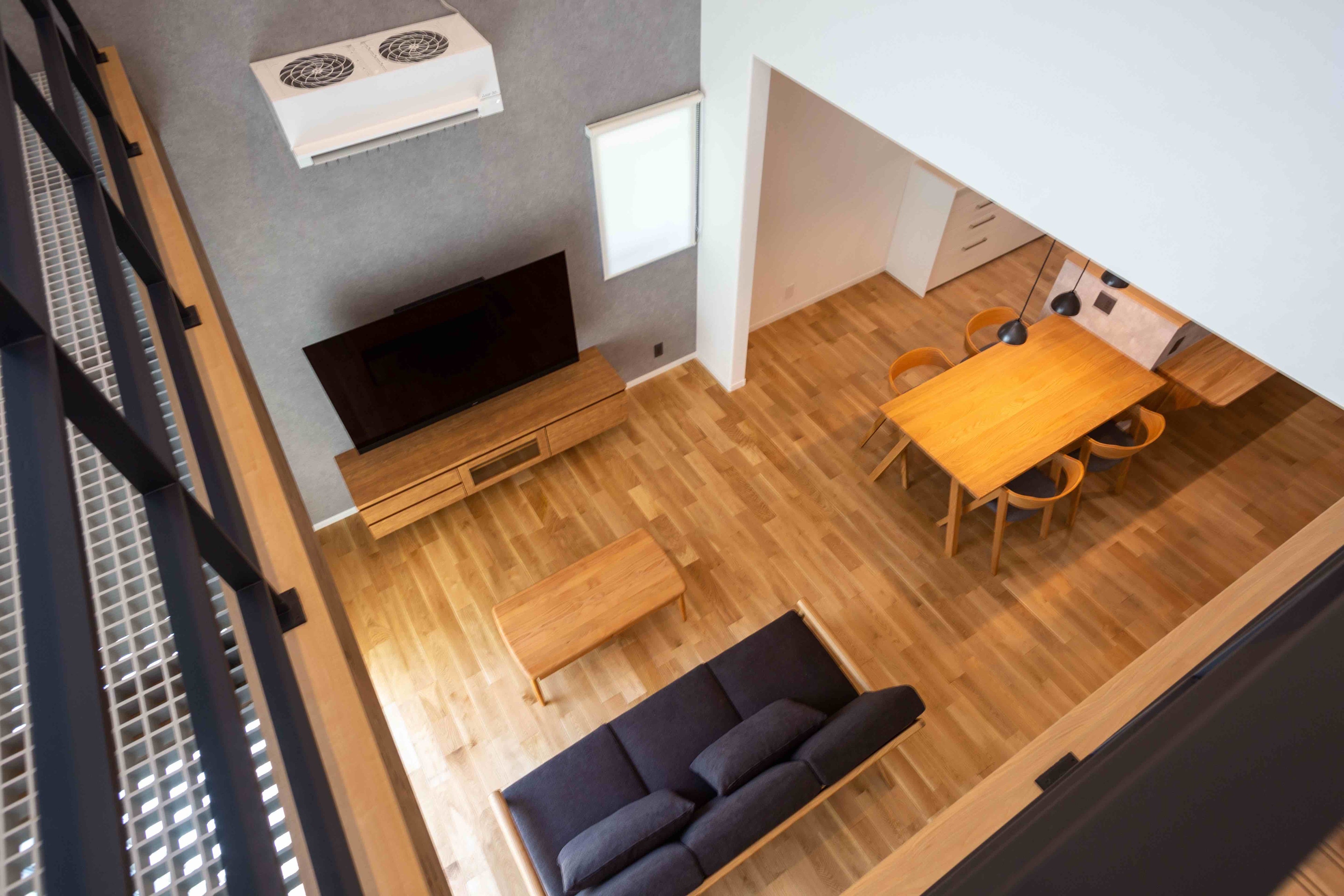 4)大きな吹き抜けに接してキャットウォークを採用。グレーチング素材から1階へ光を届けます。窓の開閉やお掃除もラクにできます。