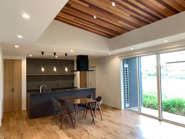 フィアスホームオリジナルの高性能パネル「eパネル」+トリプルガラス+太陽光発電の高性能住宅であり、さらに発電機も設置しているので災害に強い住宅になっています。間取りはLDKを建物の中心に配置し、その他の部屋をその周りに配置することによりプライバシーの確保とスムーズな動線計画の両立を実現しています。施主様こだわりの大空間のLDKは、床材にオーク無垢材、勾配天井部にレッドシダー無垢材を採用することで、ナチュラルであたたかみのある空間に仕上がっています。