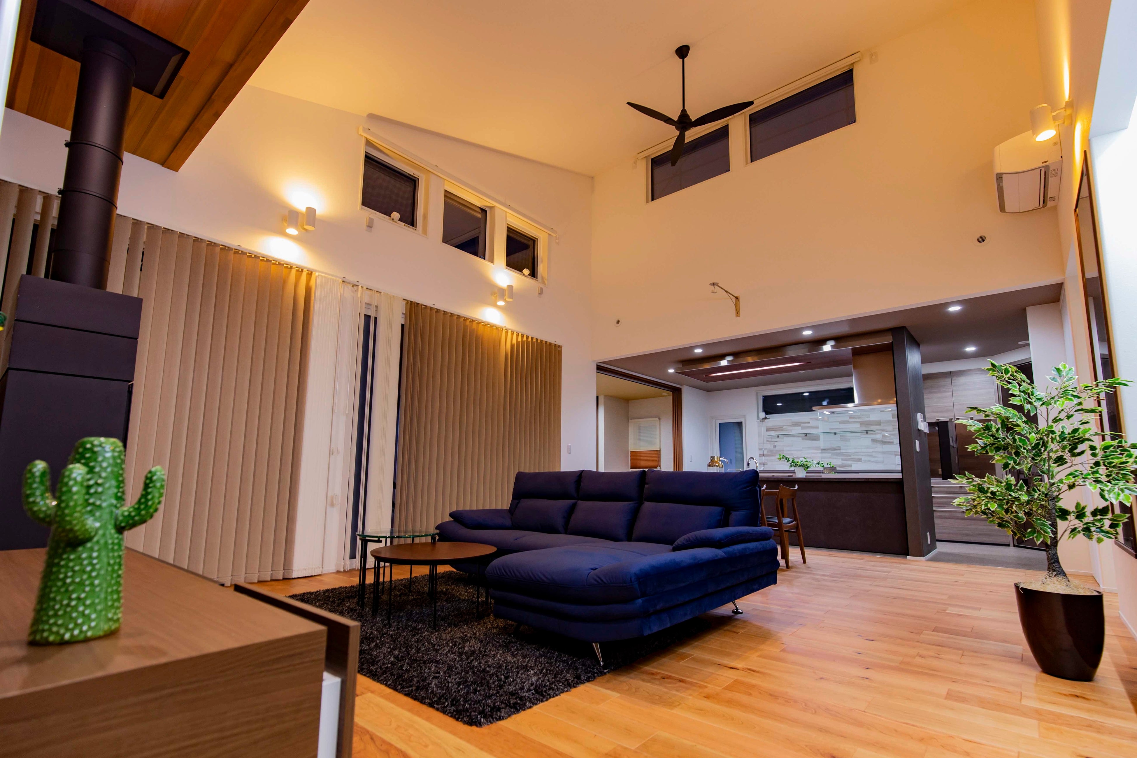 LDKは勾配天井で開放感を出し、ハイサイド窓で風の通り道も生まれる設計にしています。