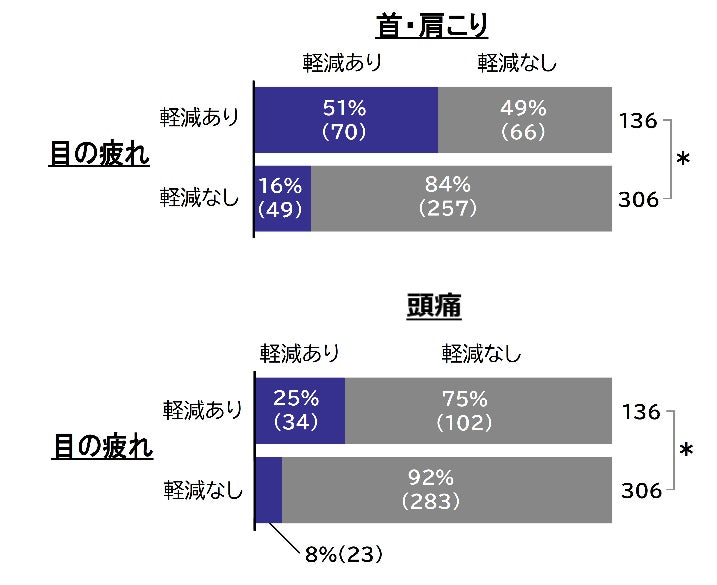 プログラム参加後に目の疲れが軽減した人のうち、首・肩こりが軽減した割合は51%、頭痛が軽減した割合は25%と、それぞれ目の疲れが軽減しなかった人に比べて、有意に割合が高かったこともわかりました。