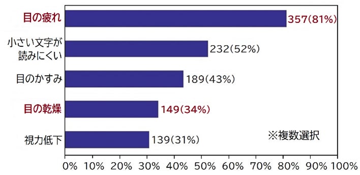 プログラム参加前の1か月間にどのような目の不調を抱えているか尋ねたところ、「目の疲れ」を有していた人は約8割、「目の乾燥」を有していた人は約3割でした。