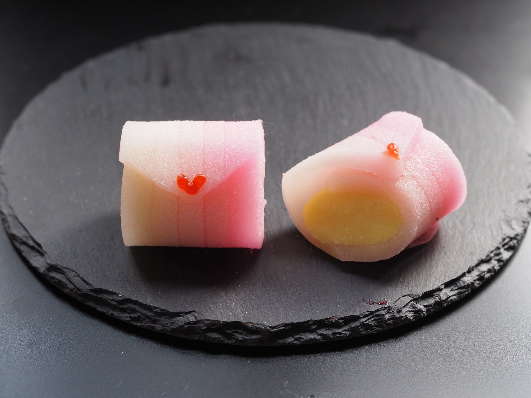 外側は、餅米を蒸して細かくしたものを寒天と砂糖を煮詰めたツヤ天の中に入れて、徐々に着色を濃くしながら流して、綺麗なグラデーションの上南羹にしました。中餡は自家製の柚子餡で、爽やかな柑橘の香りが口に広がります。手紙の形に端をカットし、最後の仕上げに赤羊かんで可愛らしいハートを描きました。