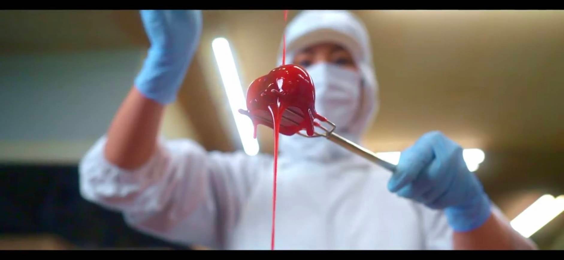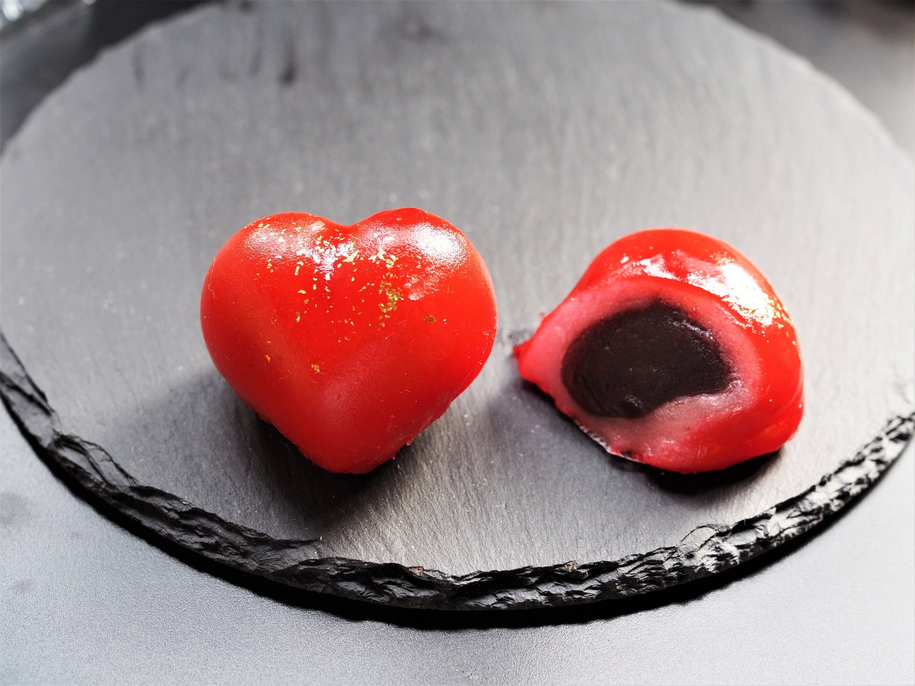 求肥餅でこし餡を包み食べ口はモチモチ食感にしてあります。1つずつ手でハート型を取り、真っ赤な光沢感を出すために赤色に着色した羊羹と寒天に砂糖を入れたツヤ天を二重にかけ、最後に金箔を振り、高級チョコレートをイメージした上品で可愛らしいハート型に仕上げました。