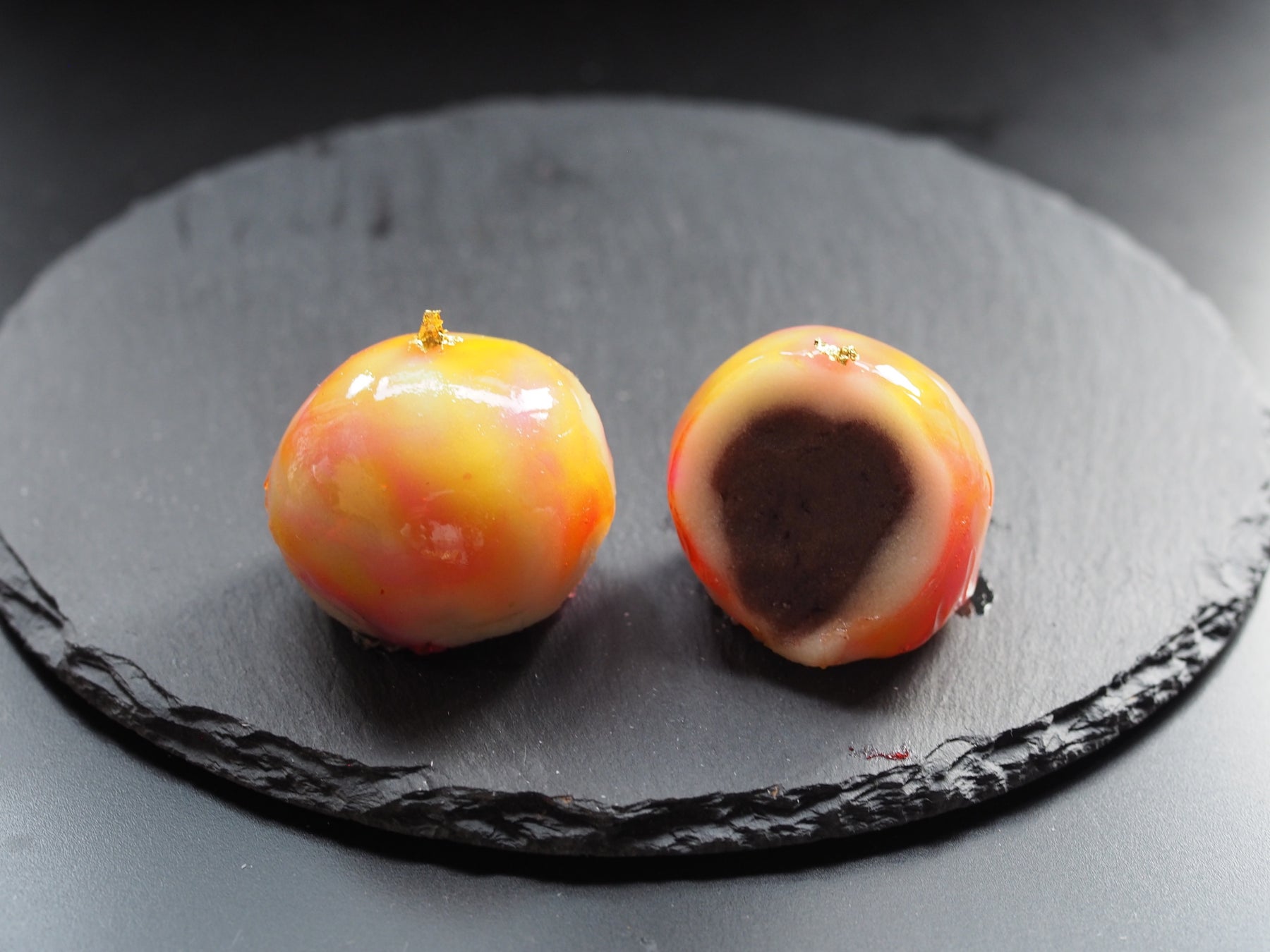 白餡に柔らかい餅を混ぜ込み粘りを出した練り切り餡で中はこし餡が包餡されています。白色の練り切り餡を丸型に成形し、上から赤と黄色に染めた寒天を流しました。固まる前に一つ一つ混ぜ合わせて宝石のように美しいマーブルに仕上げます。