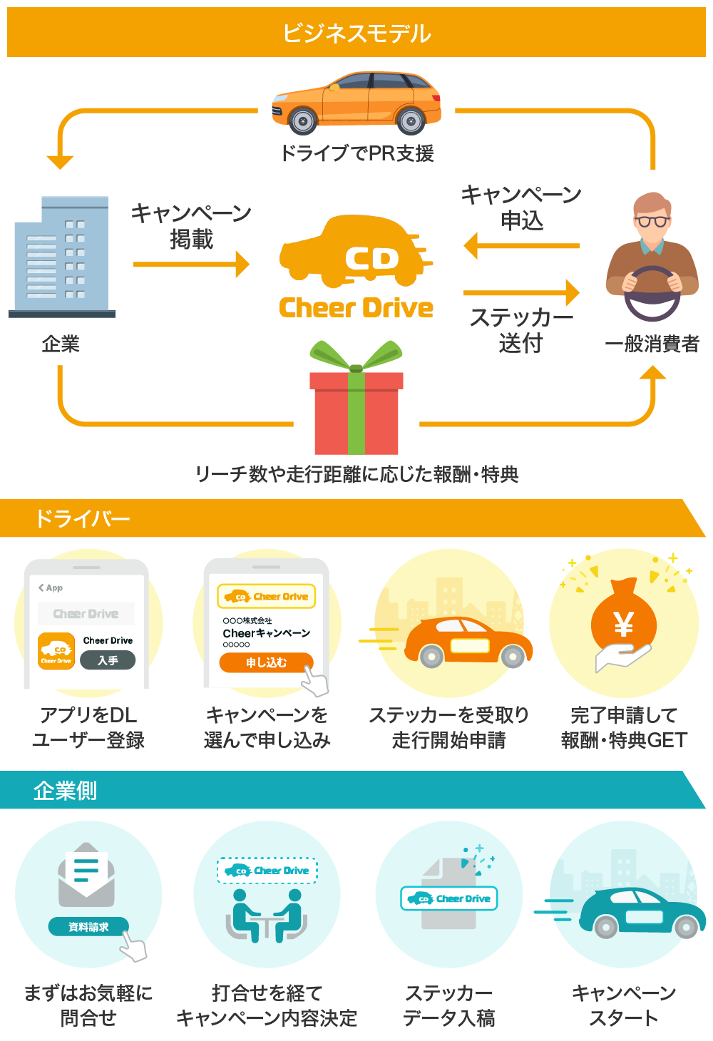 ・事業内容:一般ドライバーと企業の相互応援サービス「Cheer Drive」の運営